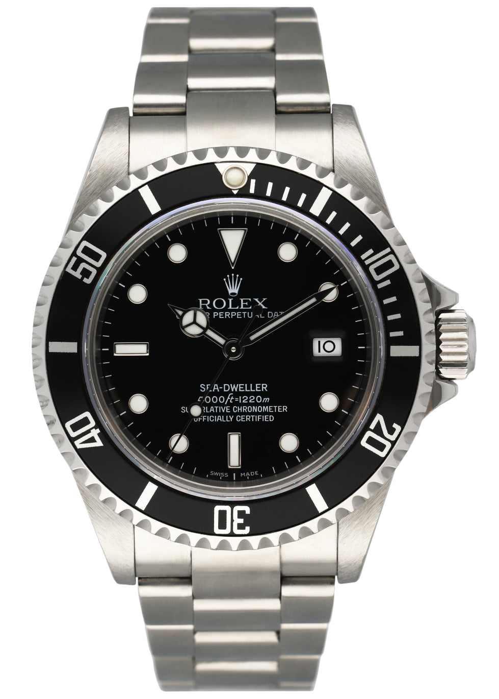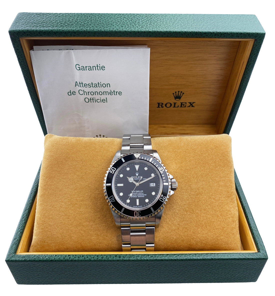 Rolex Oyster Perpetual Date Sea-Dweller 16600 Mens Watch. 40mm stainless steel case. Unidirectional rotating stainless steel bezel with black insert. Black dial with luminous Mercedes steel hands and index hour marker. Date display by the 3 o'clock position. Stainless steel Oyster bracelet with fold over clasp with safety. Will fit up to a 7-inch wrist. Sapphire crystal. Stainless steel case back. Automatic self-winding movement. This will come with original Box and Papers.