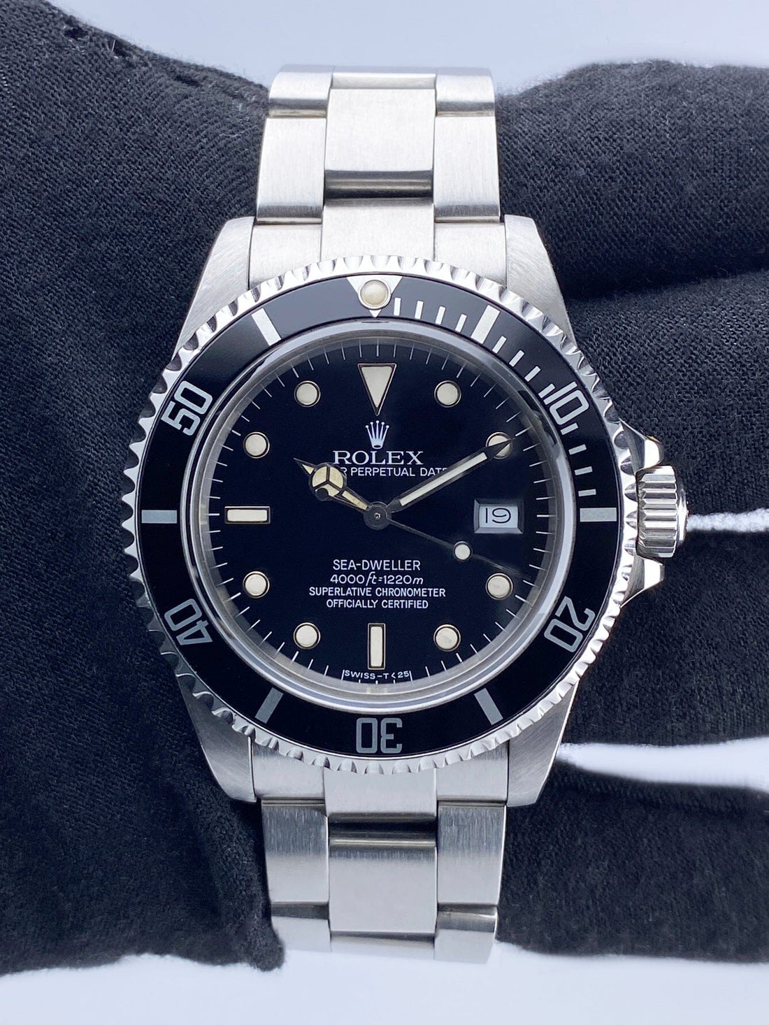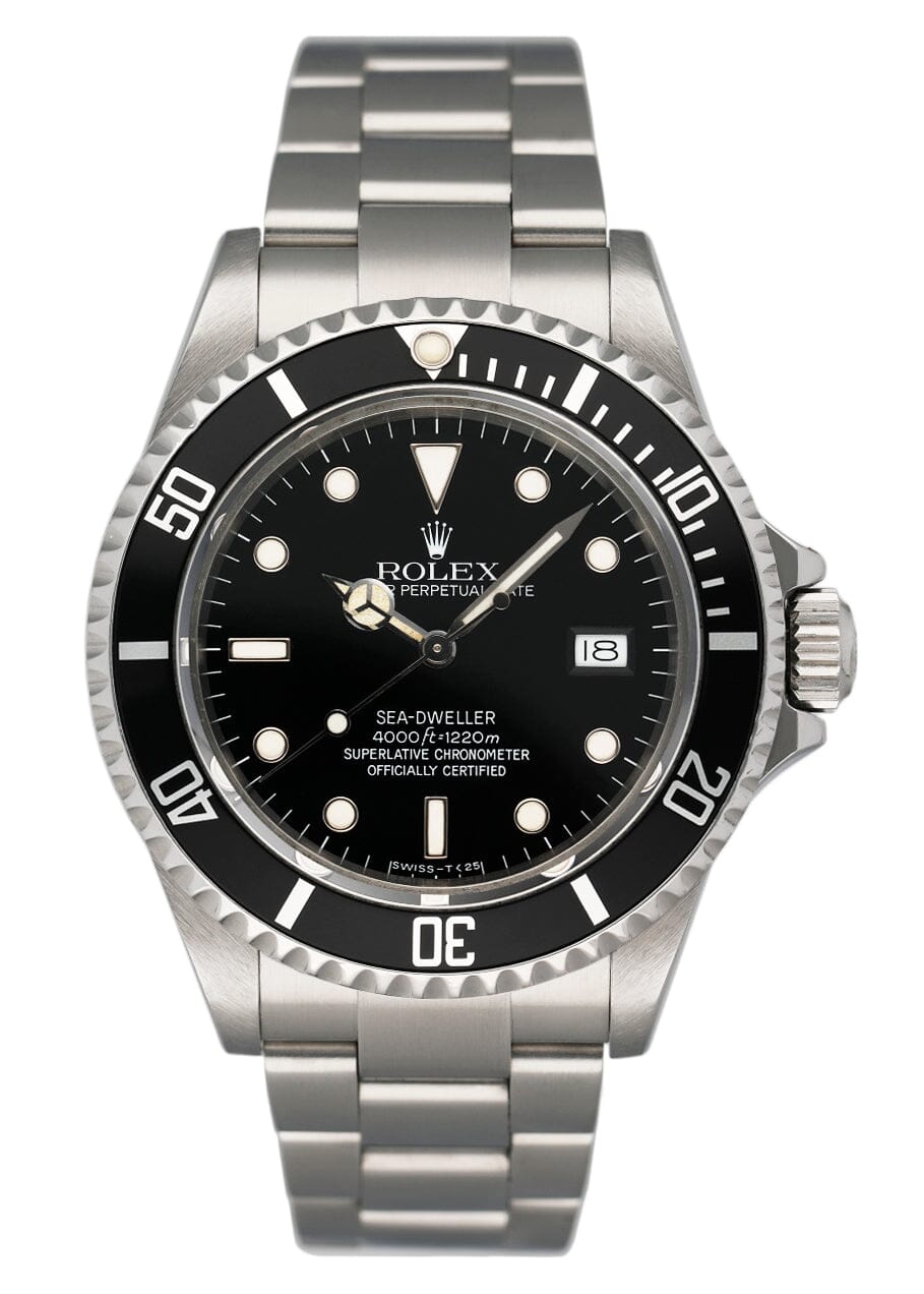 Rolex Oyster Perpetual Date Sea-Dweller 16660 Mens Watch. 40mm stainless steel case. Unidirectional rotating stainless steel bezel with black insert. Black dial with luminous Mercedes steel hands and index hour marker. Date display by the 3 o'clock position. Stainless steel Oyster bracelet with fold over clasp with safety. Will fit up to a 7-inch wrist. Sapphire crystal. Stainless steel case back. Automatic self-winding movement.