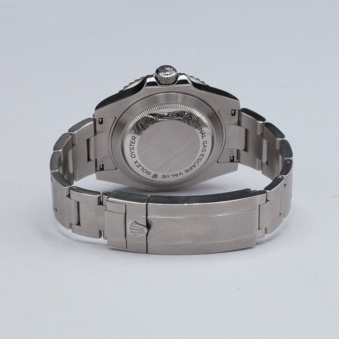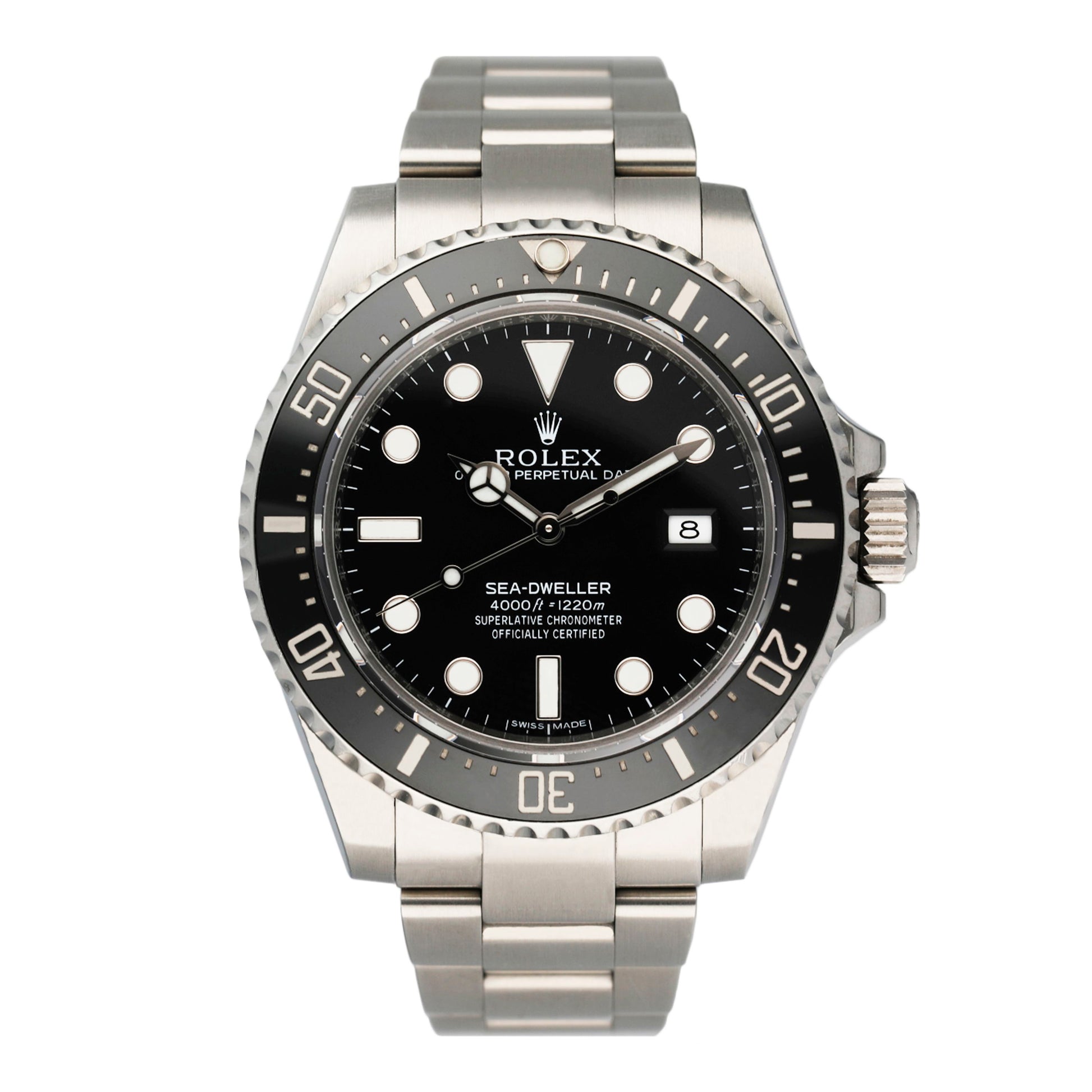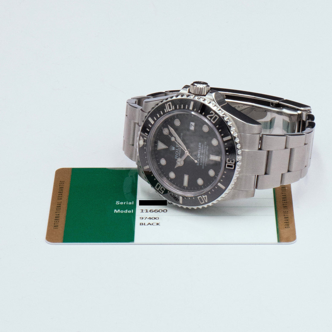 Rolex Oyster Perpetual Sea-Dweller Deep Sea 116600 Mens Watch. 44mm stainless steel case. Unidirectional stainless steel bezel with black bezel insert. Black dial with luminous steel hands and dot hour markers. Minute markers around the outer rim. Date display at the 3 o'clock position. Stainless steel Oyster bracelet with fold over safety clasp with safety. Will fit up to an 7.5-inch wrist. Automatic self-wind movement. This watch comes with original Box and Papers.