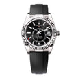 Rolex Sky-Dweller 336239 Mens Watch. 42mm 18K white gold case. 18K white gold fluted bezel. Black dial with luminous silver-tone hands and index hour markers. Minute markers on the outer dial. Date display at the 3 o'clock position. GMT 24 hour sub-dial. Black rubber Oysterflex with fold over clasp. Will fit up to a 7.5-inch wrist. Sapphire crystal. 18K white gold case back. Automatic self-winding chronometer movement with a 72-hour power reserve. This watch come with original Box and Papers.