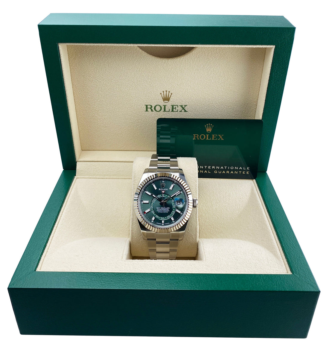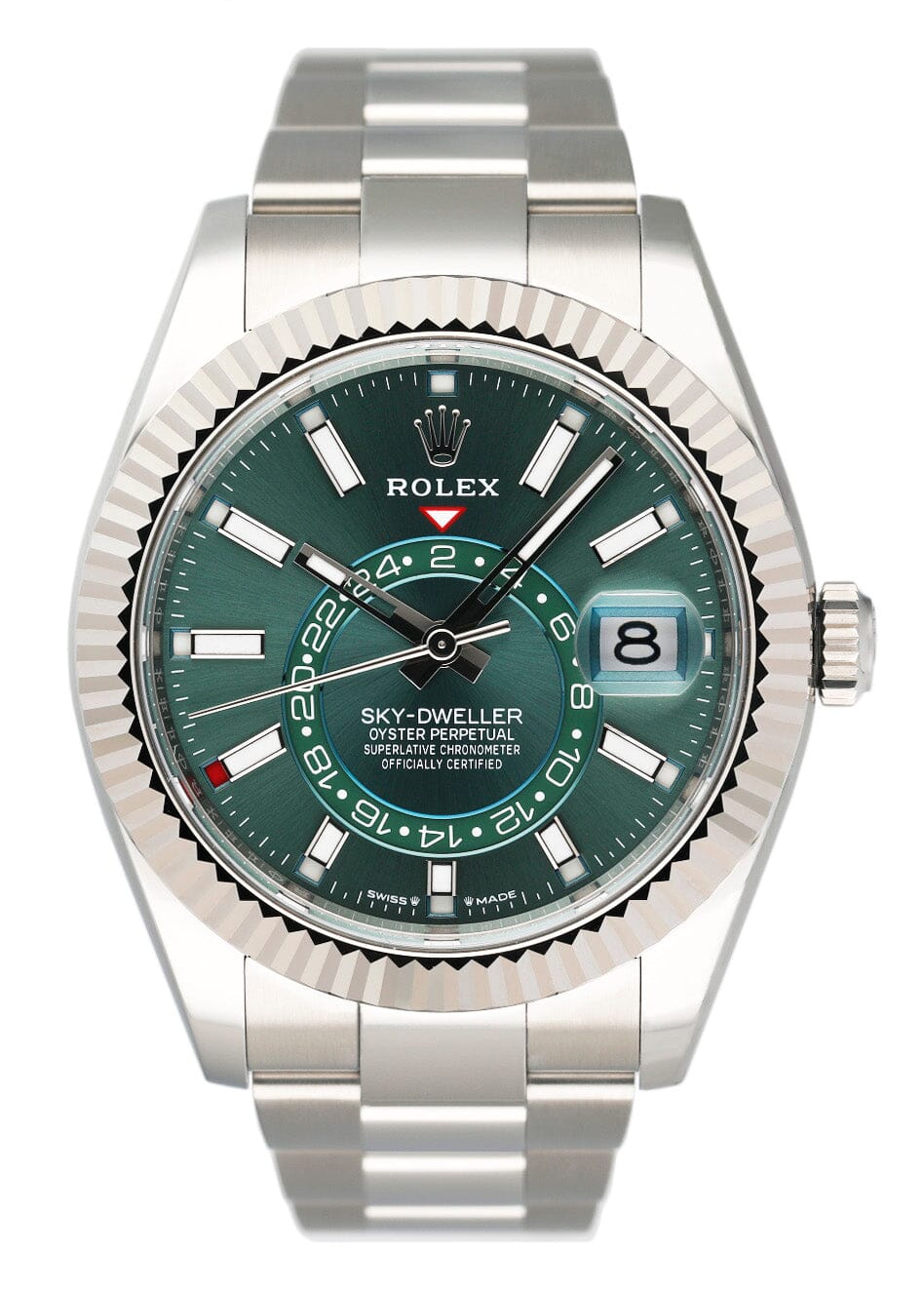 Rolex Sky-Dweller 336934 Mens Watch. 42mm stainless steel case. Bidirectional rotatable 18K white gold fluted bezel. Mint green dial with luminous steel hands and index hour markers. Minute markers on the outer dial. Date display at the 3 o'clock position. GMT 24 hour sub-dial. Stainless steel Oyster bracelet with fold over clasp. Will fit up to a 7.5-inch wrist. Sapphire crystal. Stainless steel case back. Calibre 9002 Automatic self-winding chronometer movement with a 72-hour power reserve. This watch come with original Box and Papers.