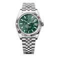 Rolex Sky-Dweller 336934 Mens Watch. 42mm stainless steel case. Bidirectional rotatable 18K white gold fluted bezel. Green dial with luminous steel hands and index hour markers. Minute markers on the outer dial. Date display at the 3 o'clock position. GMT 24 hour sub-dial. Stainless steel Jubilee bracelet with fold over clasp. Will fit up to a 7.5-inch wrist. Sapphire crystal. Stainless steel case back. Calibre 9002 Automatic self-winding chronometer movement with a 72-hour power reserve. This watch come with original Box and Papers.