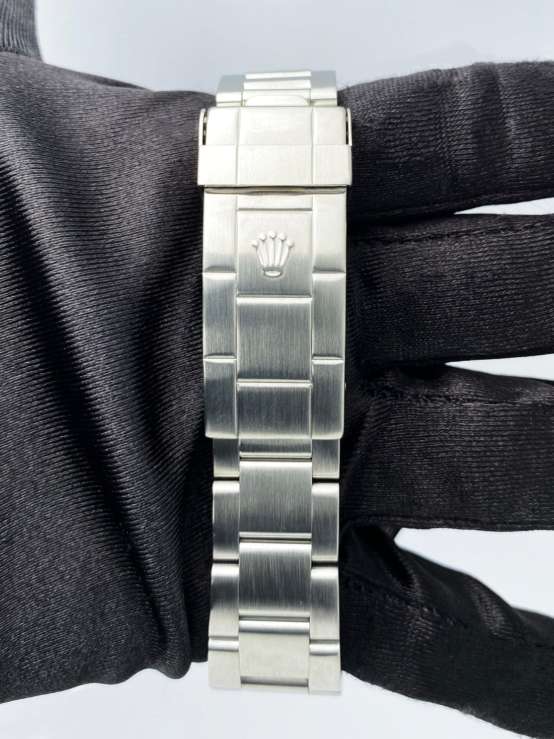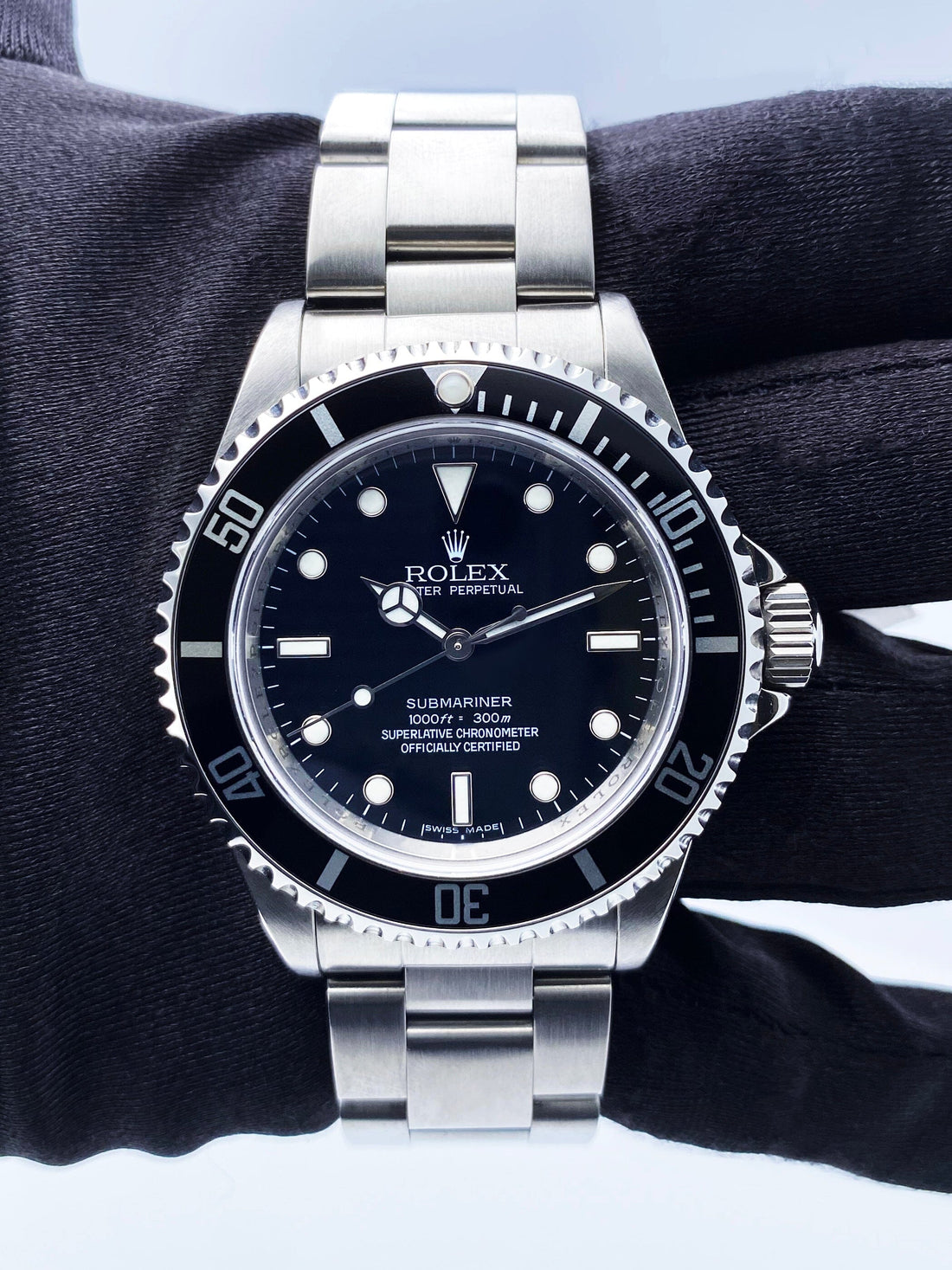 Rolex Oyster Perpetual Submariner No Date 14060 Mens Watch. 40mm stainless steel case. Unidirectional rotating bezel with black bezel insert. Black dial with luminous Mercedes steel hands and index hour marker. Engraved Rehaut. Stainless steel Oyster bracelet with a fold-over clasp with safety. Will fit up to a 7.5-inch wrist. Sapphire crystal. Stainless steel case back. Automatic self-winding movement. This watch comes with original Box and Papers.