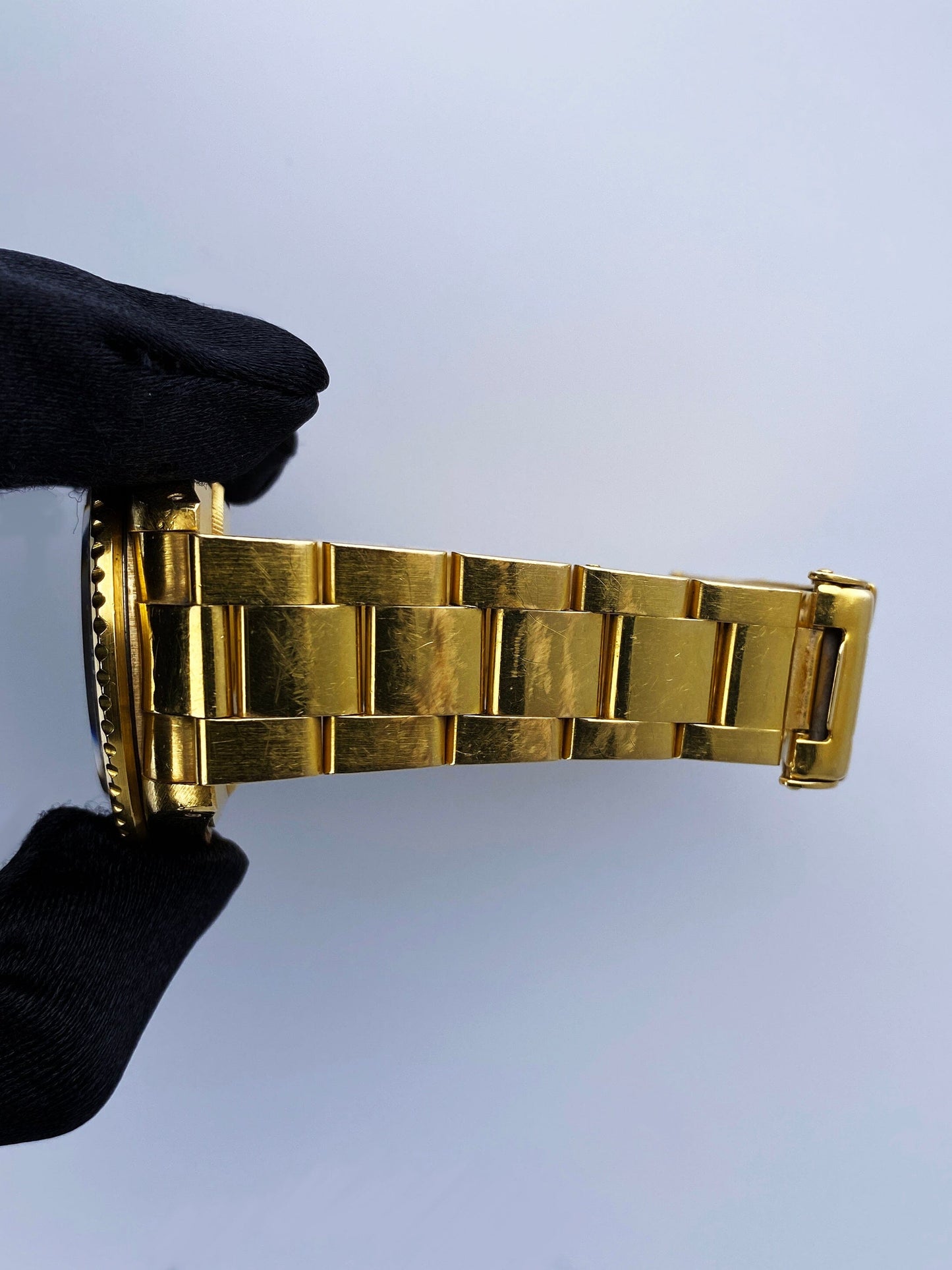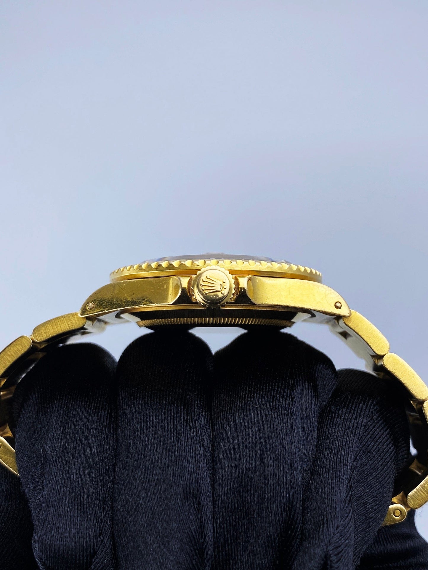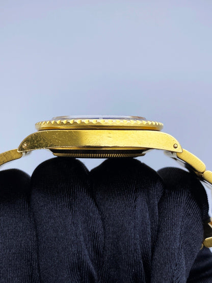 Rolex Oyster Perpetual Submariner Date 16808 Mens Watch. 40mm 18K yellow gold case. Unidirectional rotating 18K yellow gold bezel with blue insert. Champagne topical dial with Mercedes gold luminous hands and index hour markers. Minute maker on the outer dial. Date display at the 3 o'clock position. 18K yellow gold Oyster bracelet with fold over clasp with safety. Will fit up to a 6.75-inch wrist. Sapphire crystal. 18K yellow gold case back. Automatic self-winding movement.