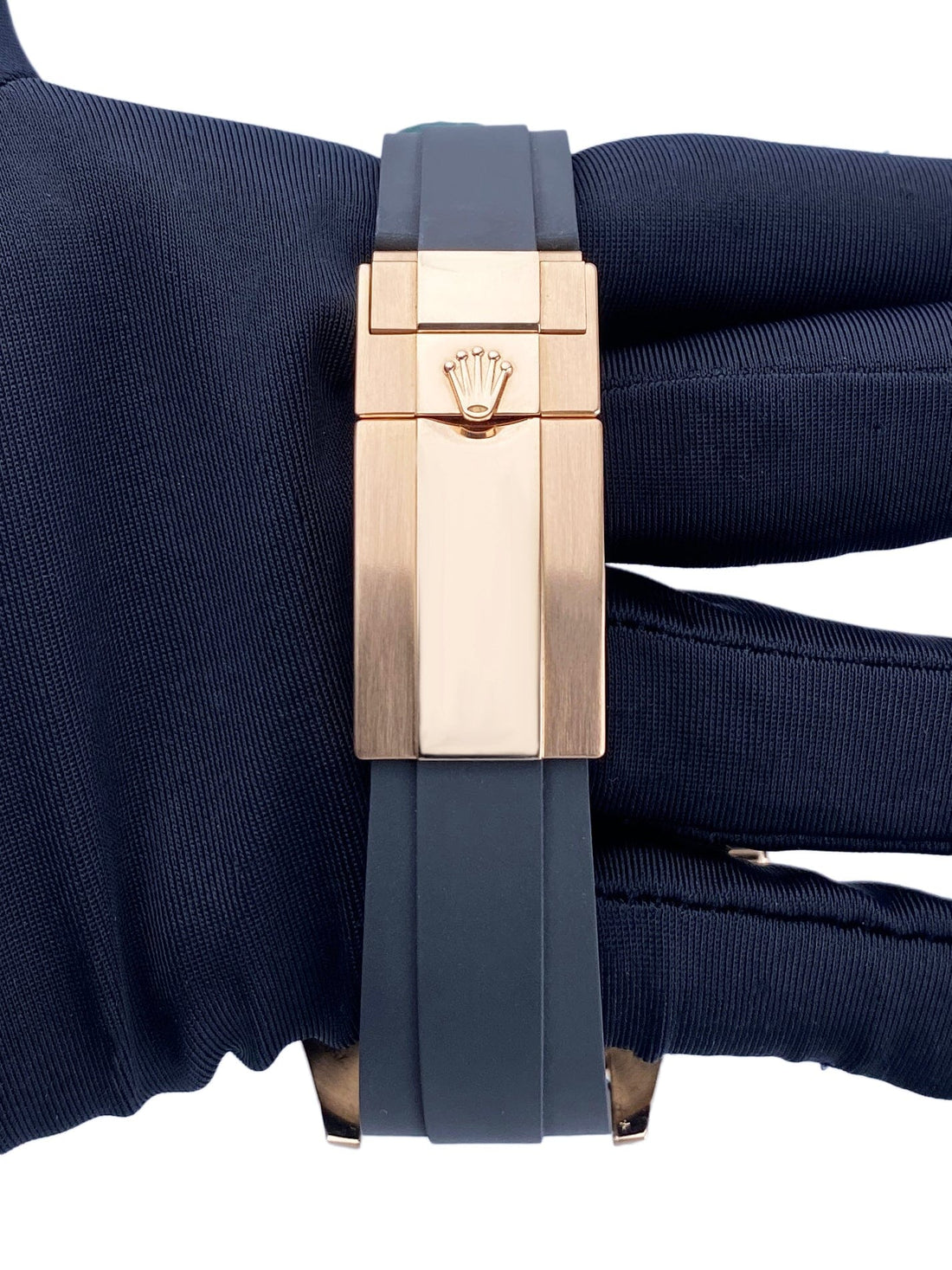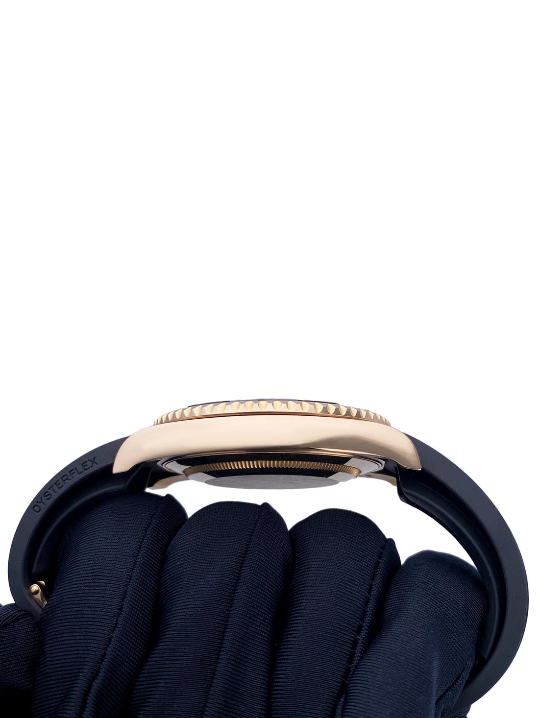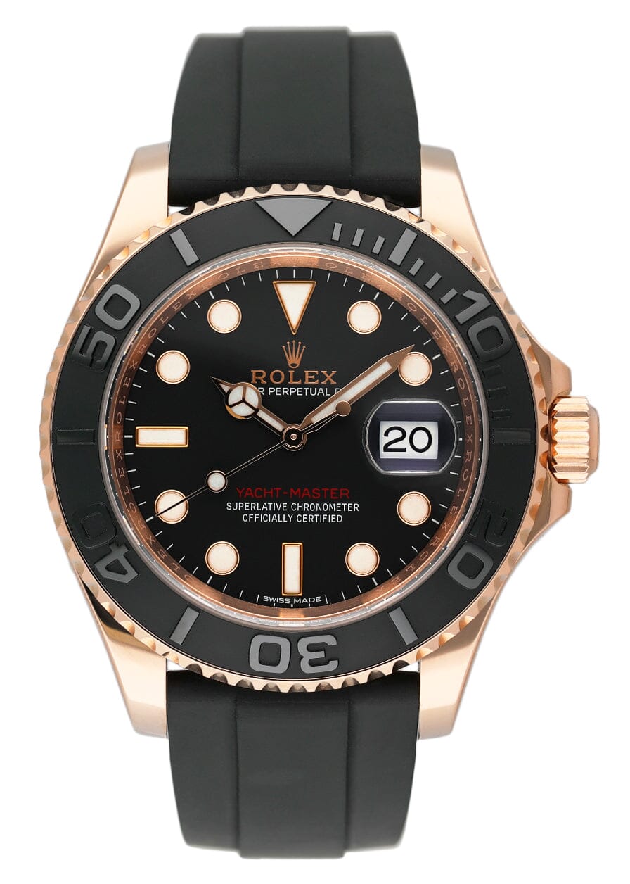 Rolex Oyster Perpetual Date Yacht-Master 116655 Mens Watch. 40mm 18K rose gold case. Bidirectional 18K rose gold bezel with black ceramic insert. Black dial with yellow gold Mercedes hands and index hours markers. Magnified date display at a 3 o'clock position. Minute marker on the outer dial. Black rubber Oysterflex bracelet with folder over clasp with safety. Will fit up to a 7-inch wrist. Sapphire crystal. 18K yellow gold case back. Automatic self-winding movement. This watch comes with original Box and Papers.