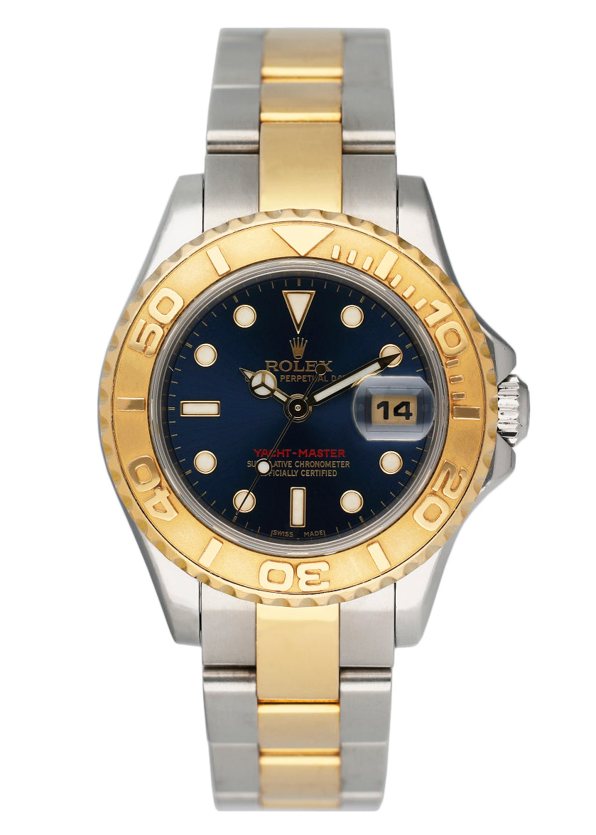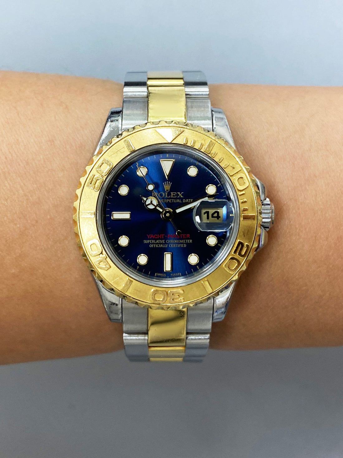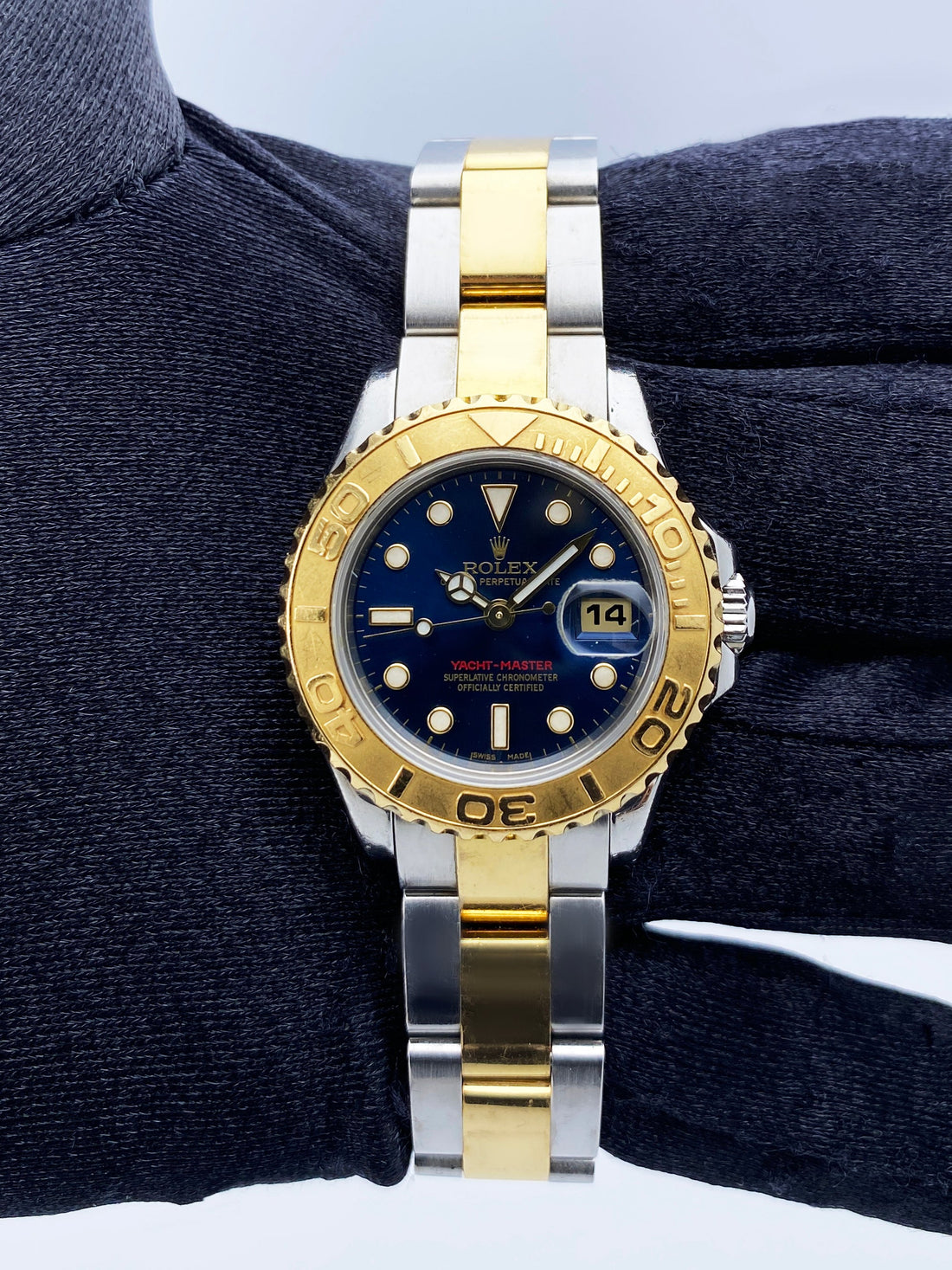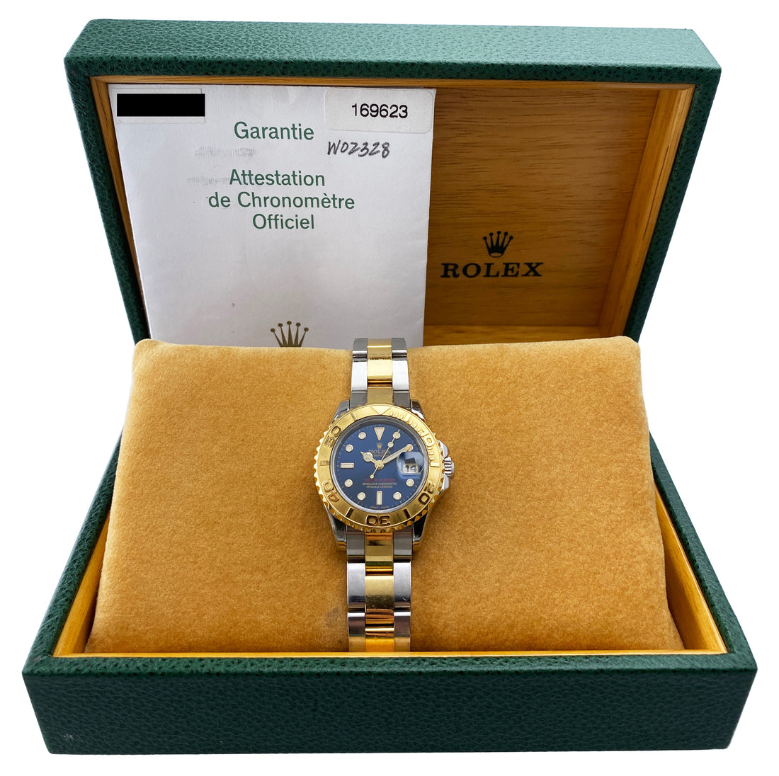 Rolex Oyster Perpetual Date Yacht-Master 169623 Ladies Watch. 29mm stainless steel case with a bi-directional 18k yellow gold bezel. Blue dial with gold Mercedes hands and index hours markers. Magnified date display at a 3 o'clock position. Minute marker on the outer dial. 18K yellow gold and stainless steel Oyster bracelet with folder over clasp with safety. Will fit up to a 6-inch wrist. Sapphire crystal. Stainless steel case back. Automatic self-winding movement. This watch comes with original Box and Papers.