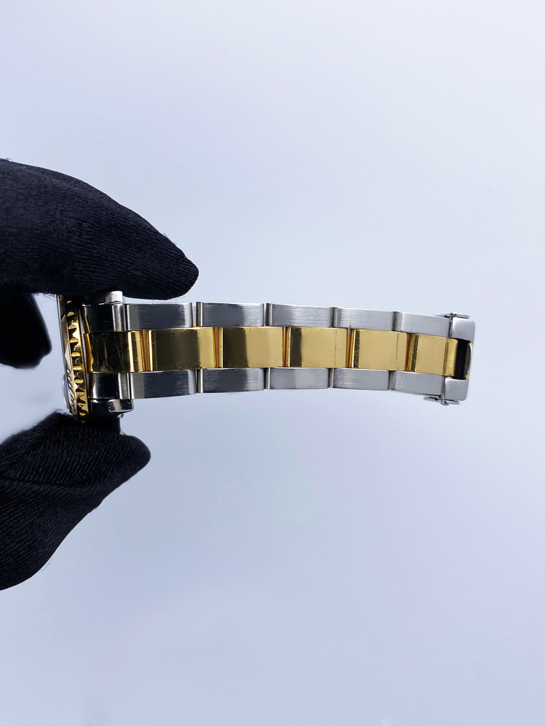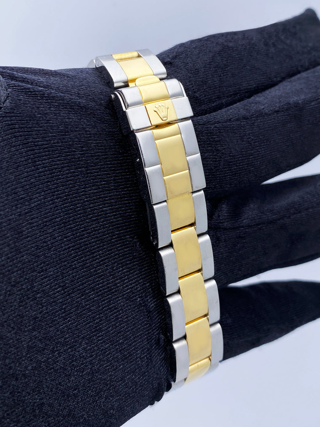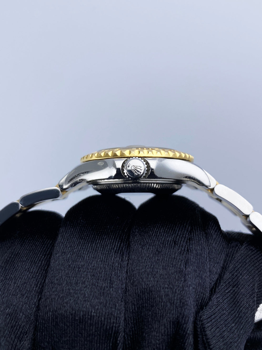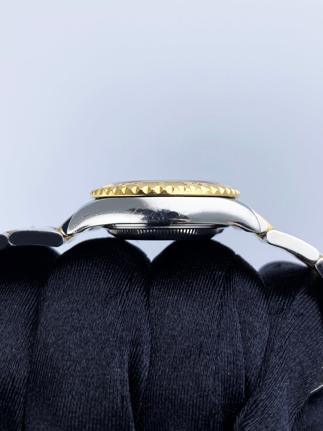 Rolex Oyster Perpetual Date Yacht-Master 169623 Ladies Watch. 29mm stainless steel case with a bi-directional 18k yellow gold bezel. Blue dial with gold Mercedes hands and index hours markers. Magnified date display at a 3 o'clock position. Minute marker on the outer dial. 18K yellow gold and stainless steel Oyster bracelet with folder over clasp with safety. Will fit up to a 6-inch wrist. Sapphire crystal. Stainless steel case back. Automatic self-winding movement. This watch comes with original Box and Papers.