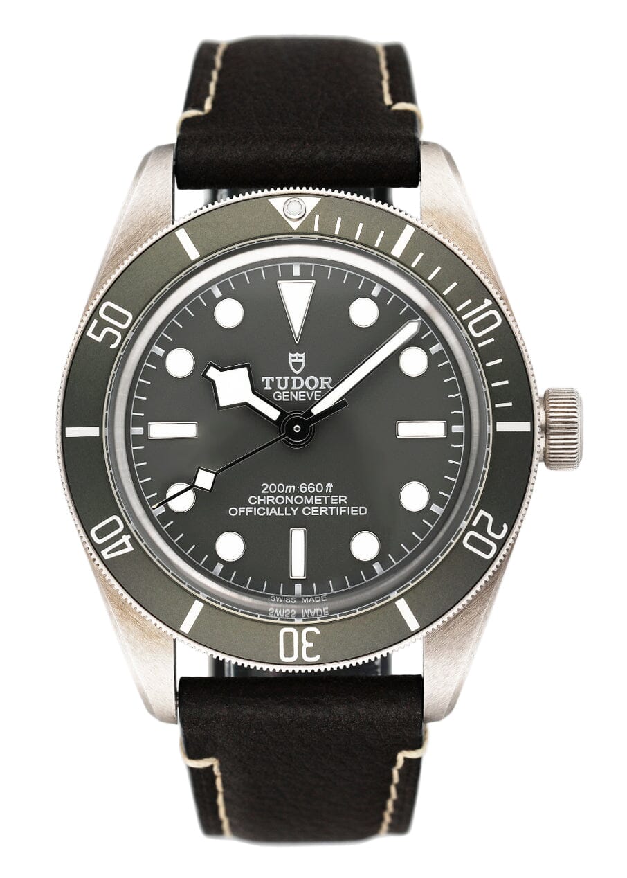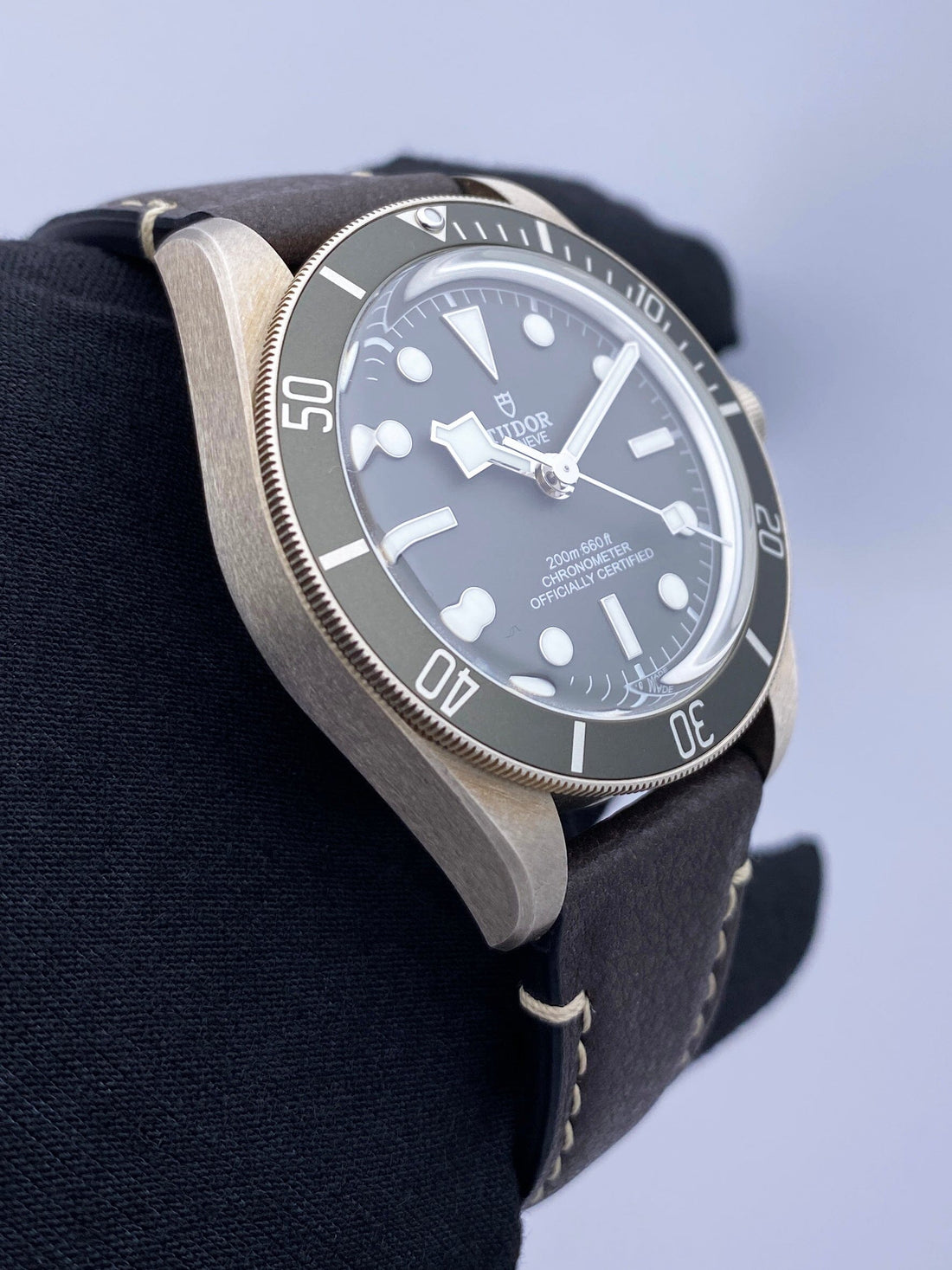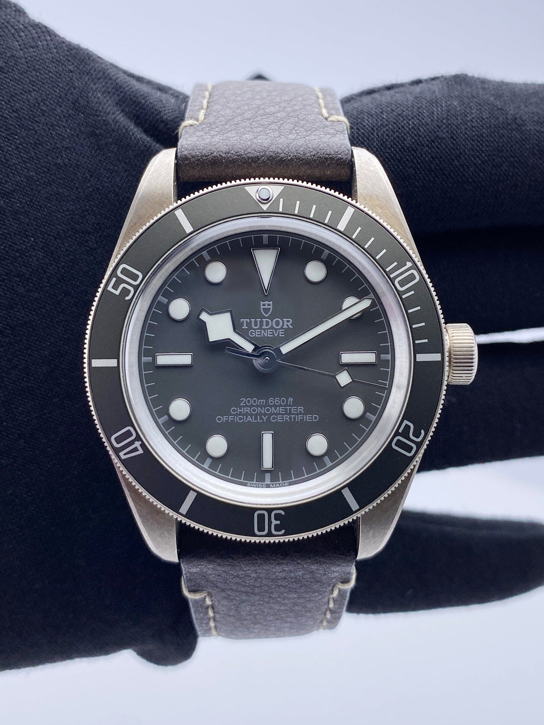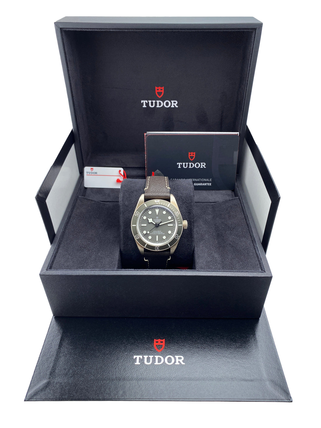 Tudor Black Bay M79010SG-0001 Mens Watch. 39mm silver case. Unidirectional rotating silver bezel with taupe aluminium insert. Taupe dial with luminous hands and index hour marker. Minute marker on the outer dial. Brown leather strap with silver buckle. Will fit up to a 7.5-inch wrist. Sapphire crystal. Silver case back. Calibre MT5400 automatic self-winding movement. This watch comes with original Box and Papers.