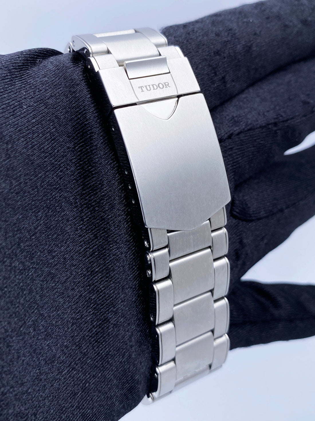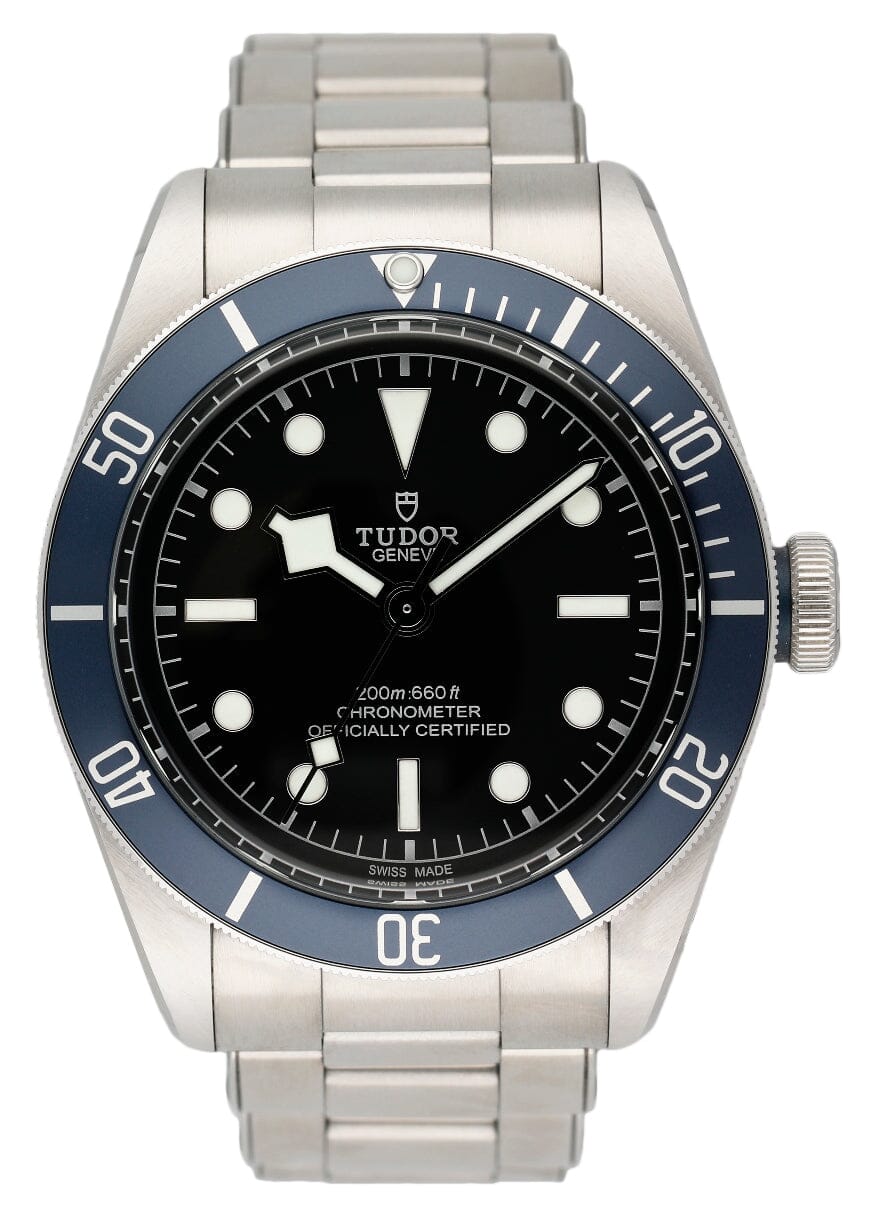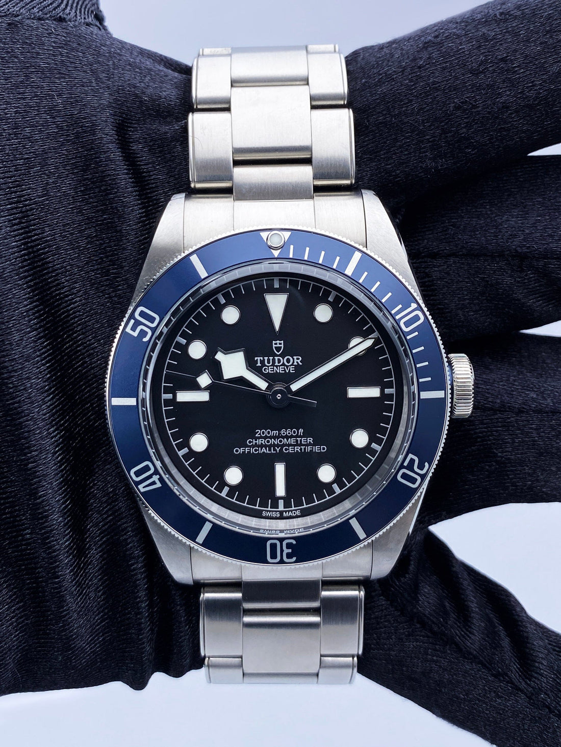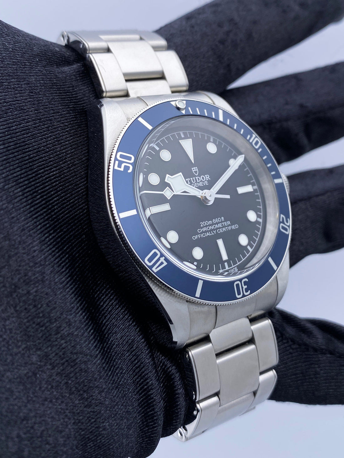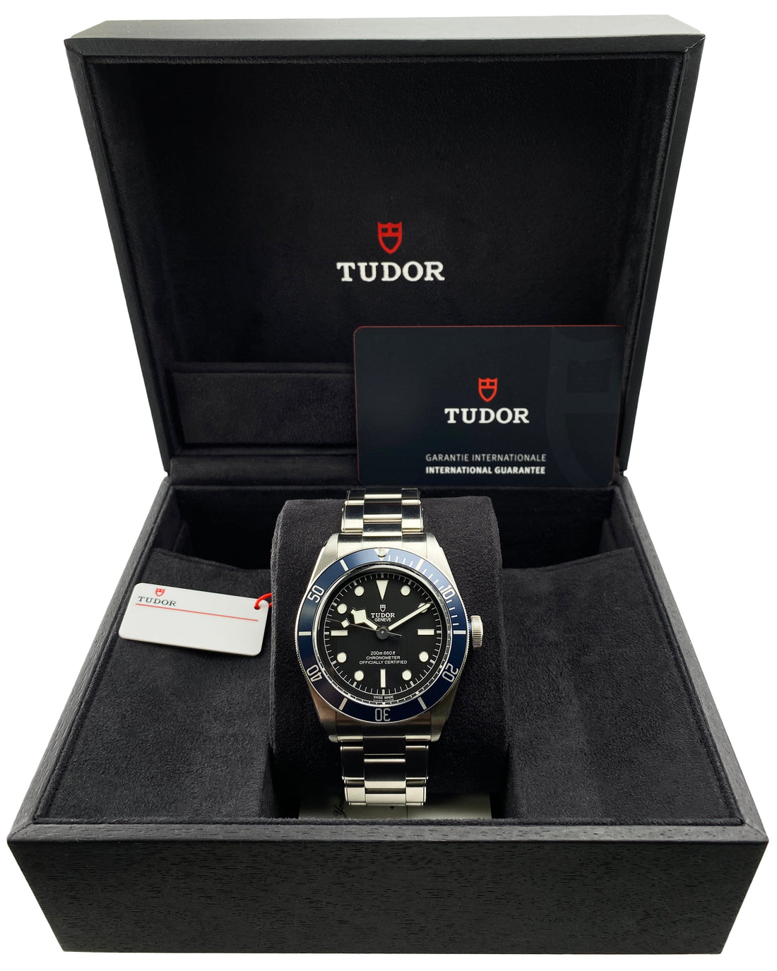 Tudor Black Bay 79230B-0008 Mens Watch. 41mm stainless steel case. Unidirectional rotating stainless steel bezel with blue aluminium insert. Black dial with luminous steel hands and index hour marker. Minute marker on the outer dial. Stainless steel bracelet with a fold-over clasp with safety. Will fit up to a 7-inch wrist. Sapphire crystal. Stainless steel case back. Calibre MT5602 automatic self-winding movement with 70 hours power reserve. This watch comes with original Box and Papers. Circa: 2021.