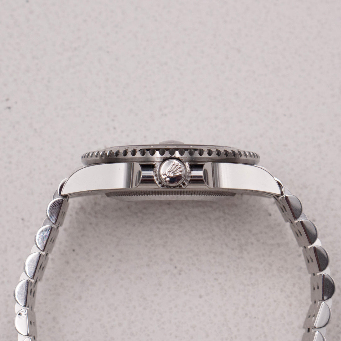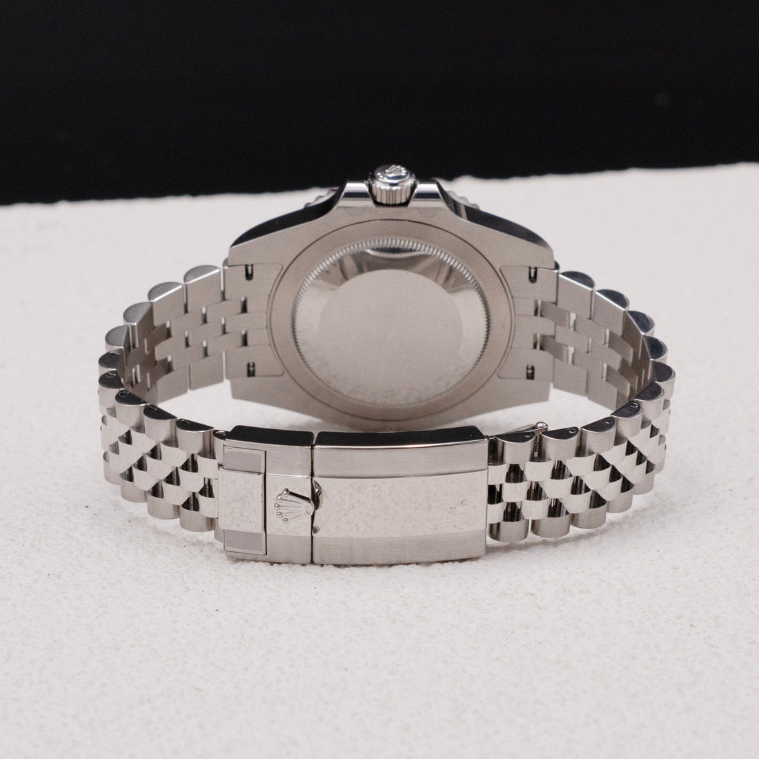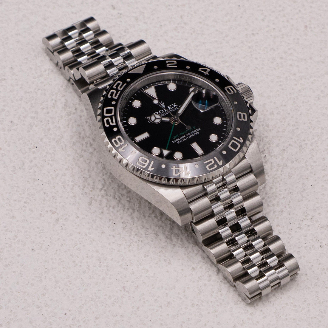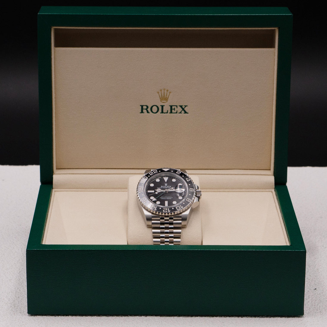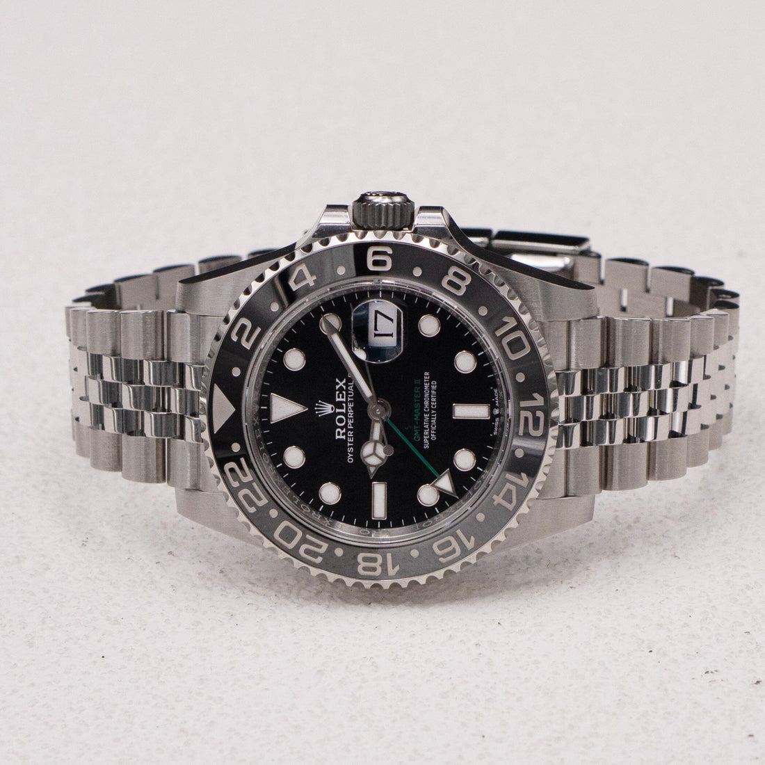 Rolex Oyster Perpetual Date GMT-Master II 126710GRNR Mens Watch. 40mm stainless steel case. Bidirectional rotating black and Grey ceramic bezel insert. Black dial with luminous steel hands and dot hour markers. Minute maker on the outer dial. Date display at the 3 o'clock position. Stainless steel Jubilee bracelet with stainless steel fold over clasp with safety. Will fit up to a 7.5-inch wrist. Sapphire crystal. Automatic self-winding movement. This watch comes with original Box and Papers.