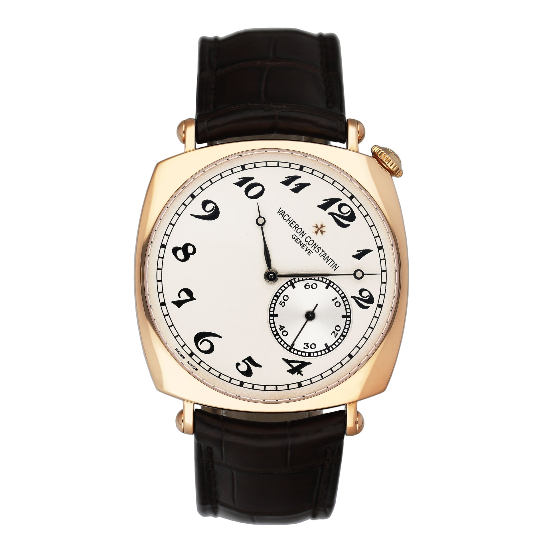 Vacheron Constantin Historiques American 1921 82035/000R Mens Watch. 40mm 18K rose gold case. 18K rose gold bezel. Silver dial with silver-tone hands and Arabic numerals hour markers. Minute makers on the outer dial. Crown placed between 1 and 2 o'clock. Small seconds is between 3 and 4 o'clock. Brown leather strap with buckle. Will fit up to 7-Inch wrist. Sapphire crystal. Transparent sapphire crystal case back. Mechanical hand-winding movement. This watch comes with original Box and Papers.