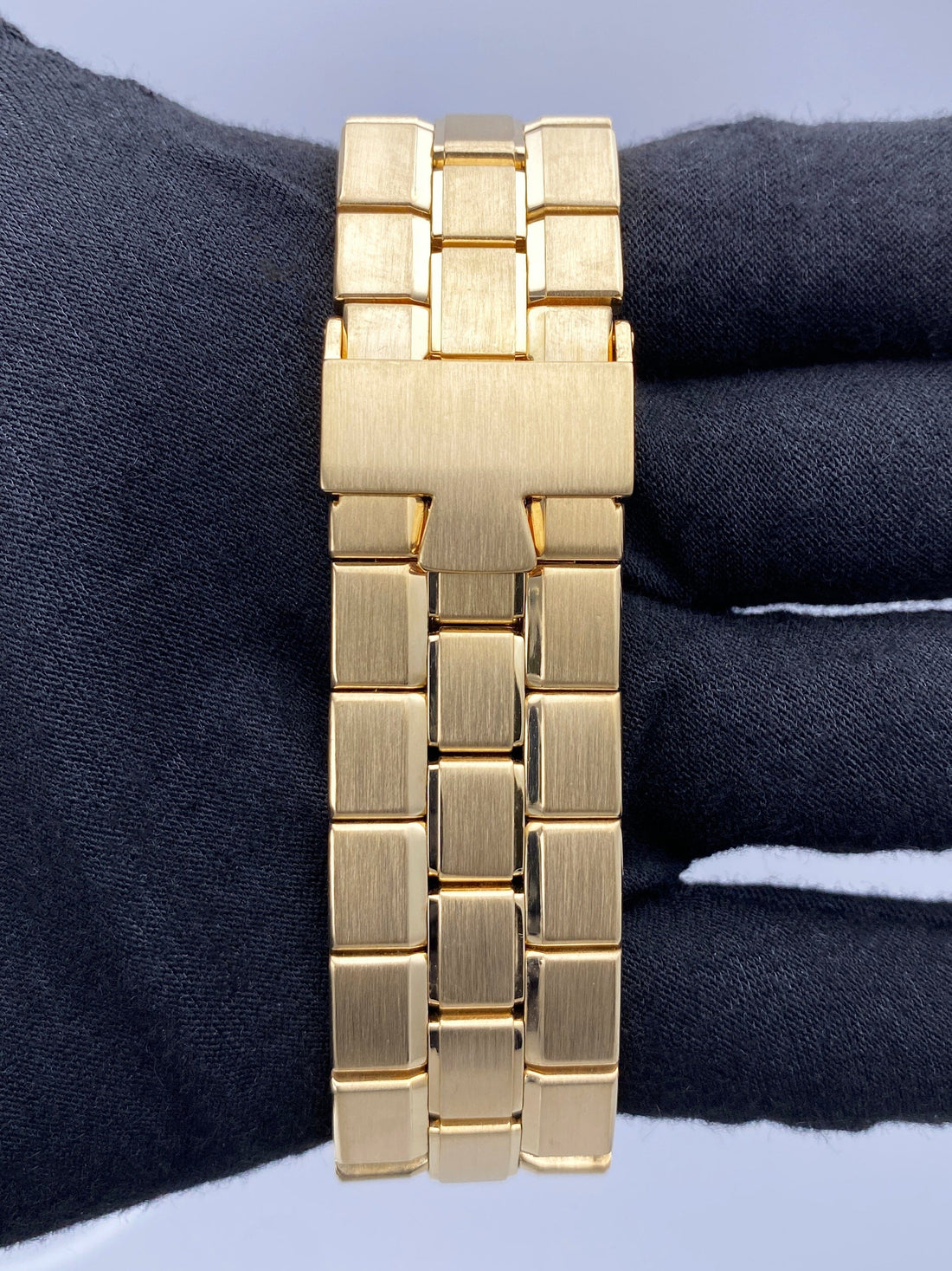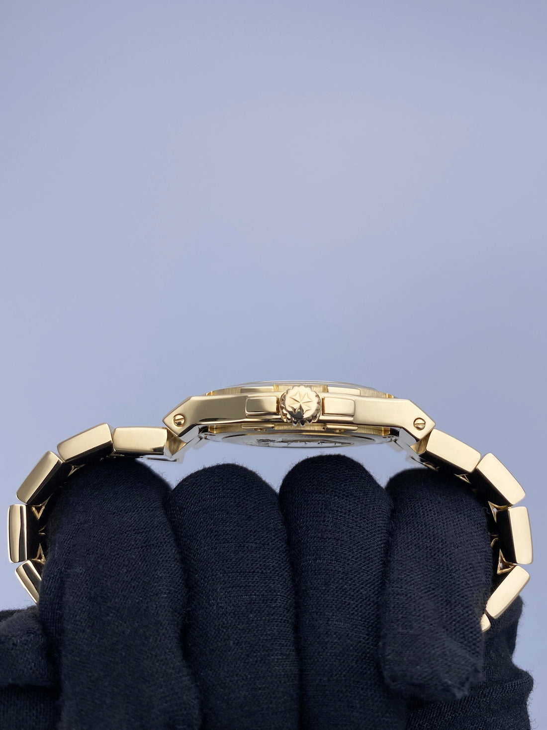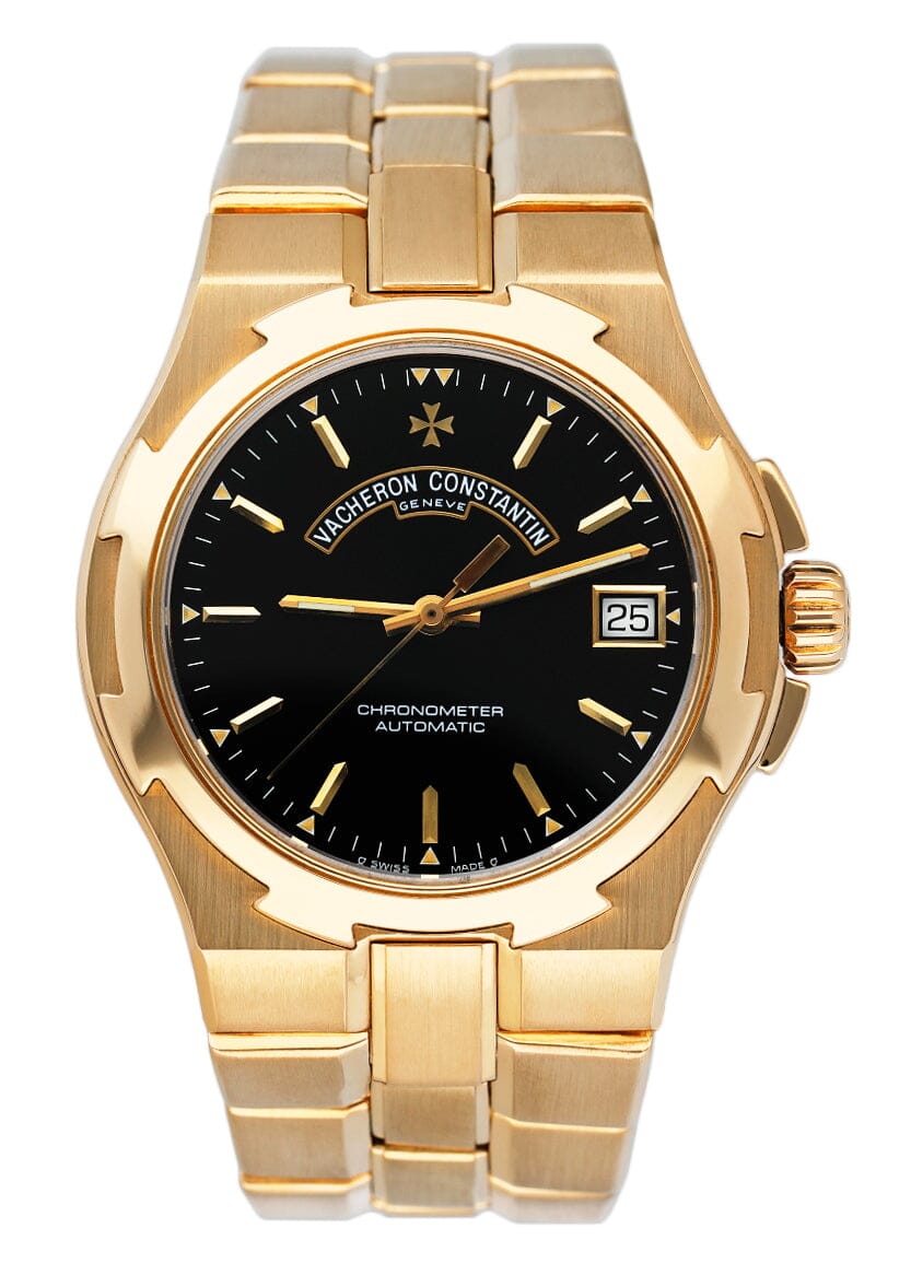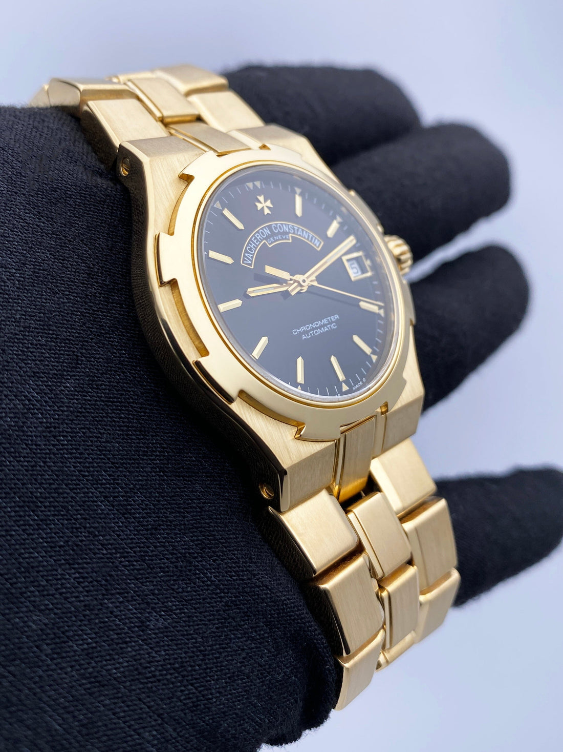 Vacheron Constantin Overseas 42040 Mens Watch. 37mm 18K yellow gold case. 18K yellow gold bezel. Black dial with luminous gold hands and index hour markers. Minute makers on the outer dial. Date display at 3 o'clock position. 18K yellow gold bracelet with hidden butterfly clasp with double safety. Will fit up to 7-Inch wrist. Sapphire crystal. 18K yellow gold case back. Automatic self-winding movement.