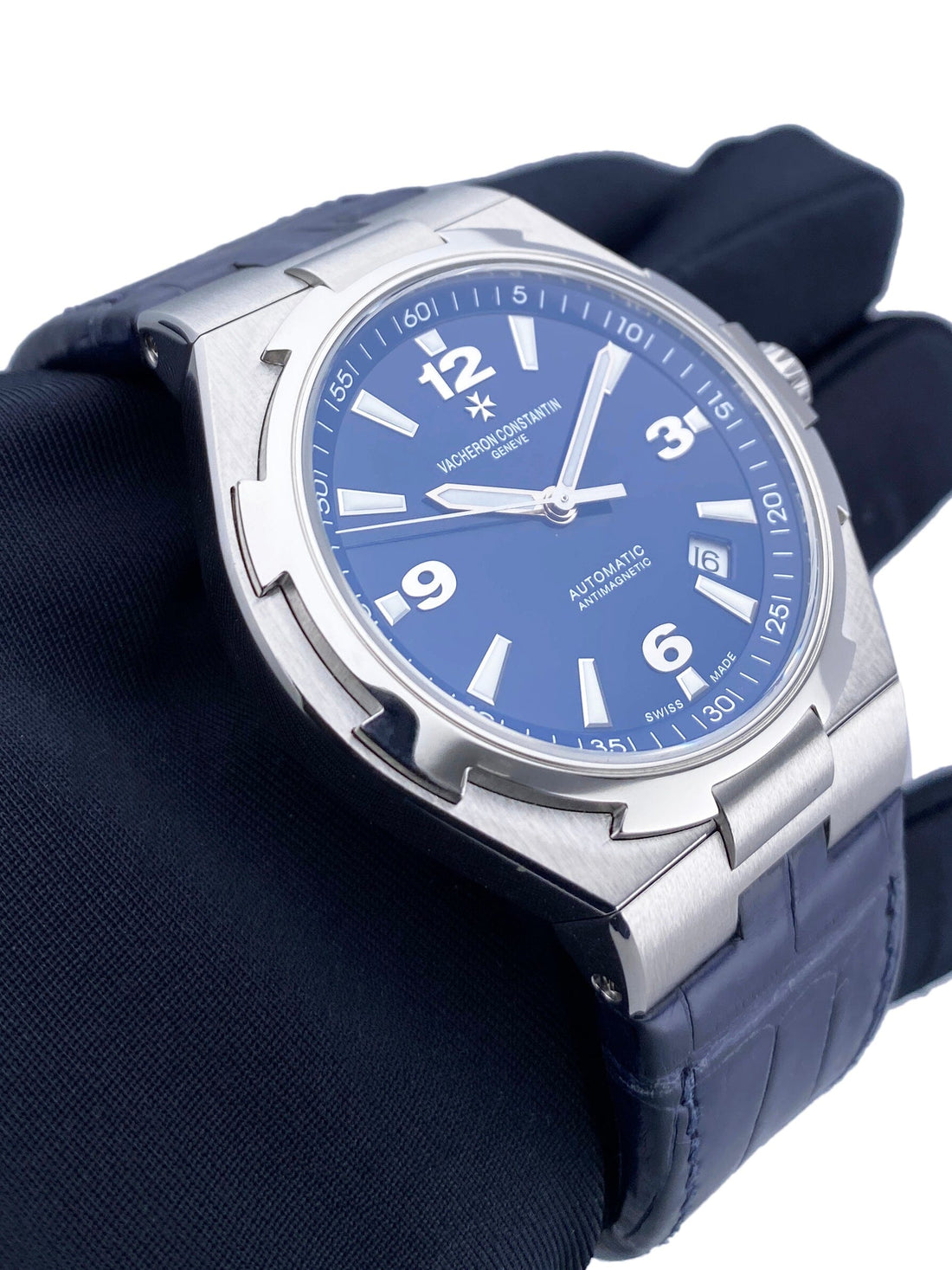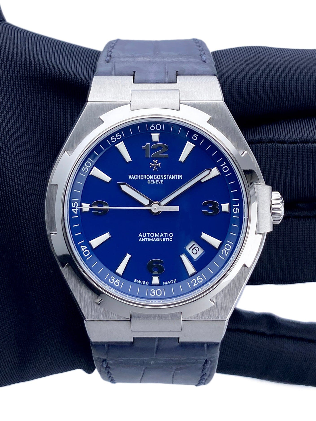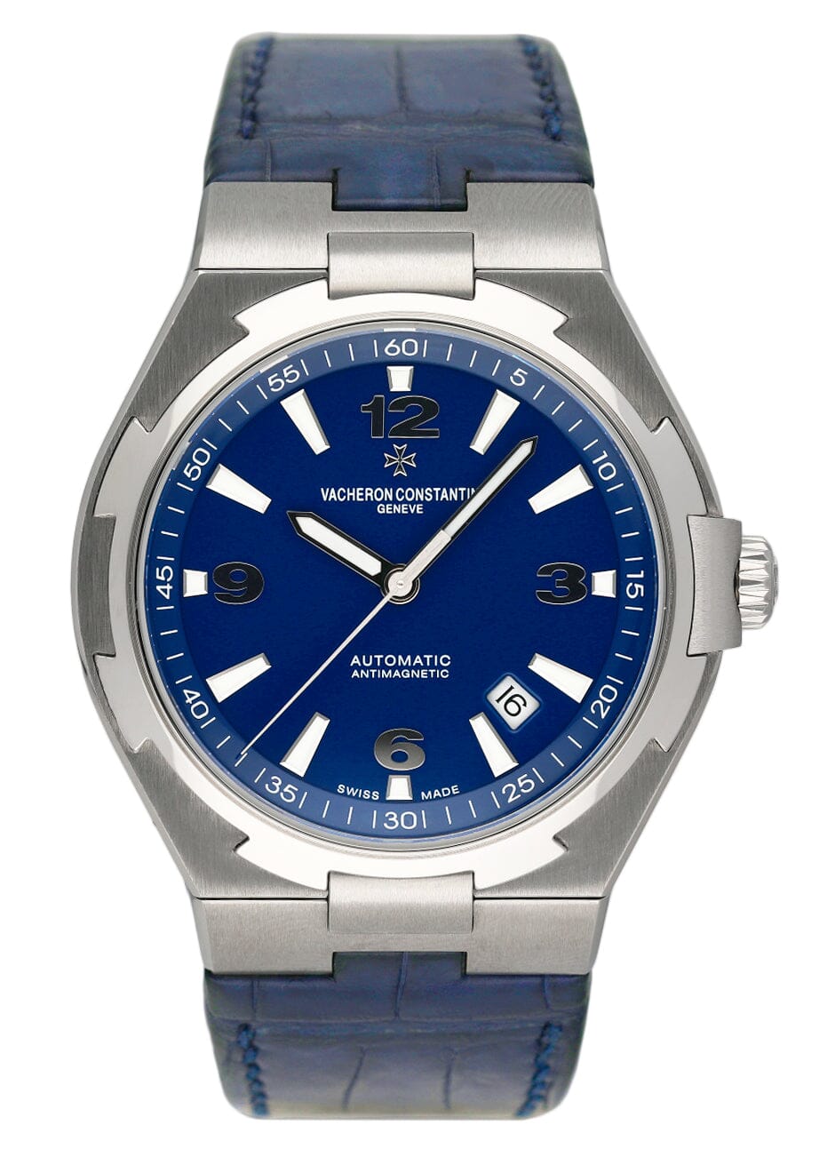 Vacheron Constantin Overseas 47040/000A Mens Watch. 42mm stainless steel case. Stainless steel bezel. Blue dial with luminous hands. Arabic numerals and index hour markers. Minute makers on the outer dial. Date display between 4 and 5 o'clock position. Dark blue leather strap with deployment buckle. Will fit up to 7-Inch wrist. Sapphire crystal. Stainless steel case back. Automatic self-winding movement.