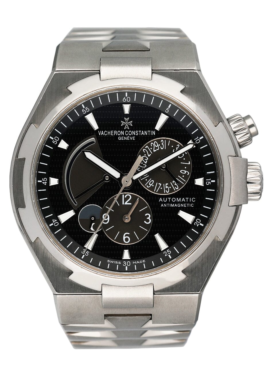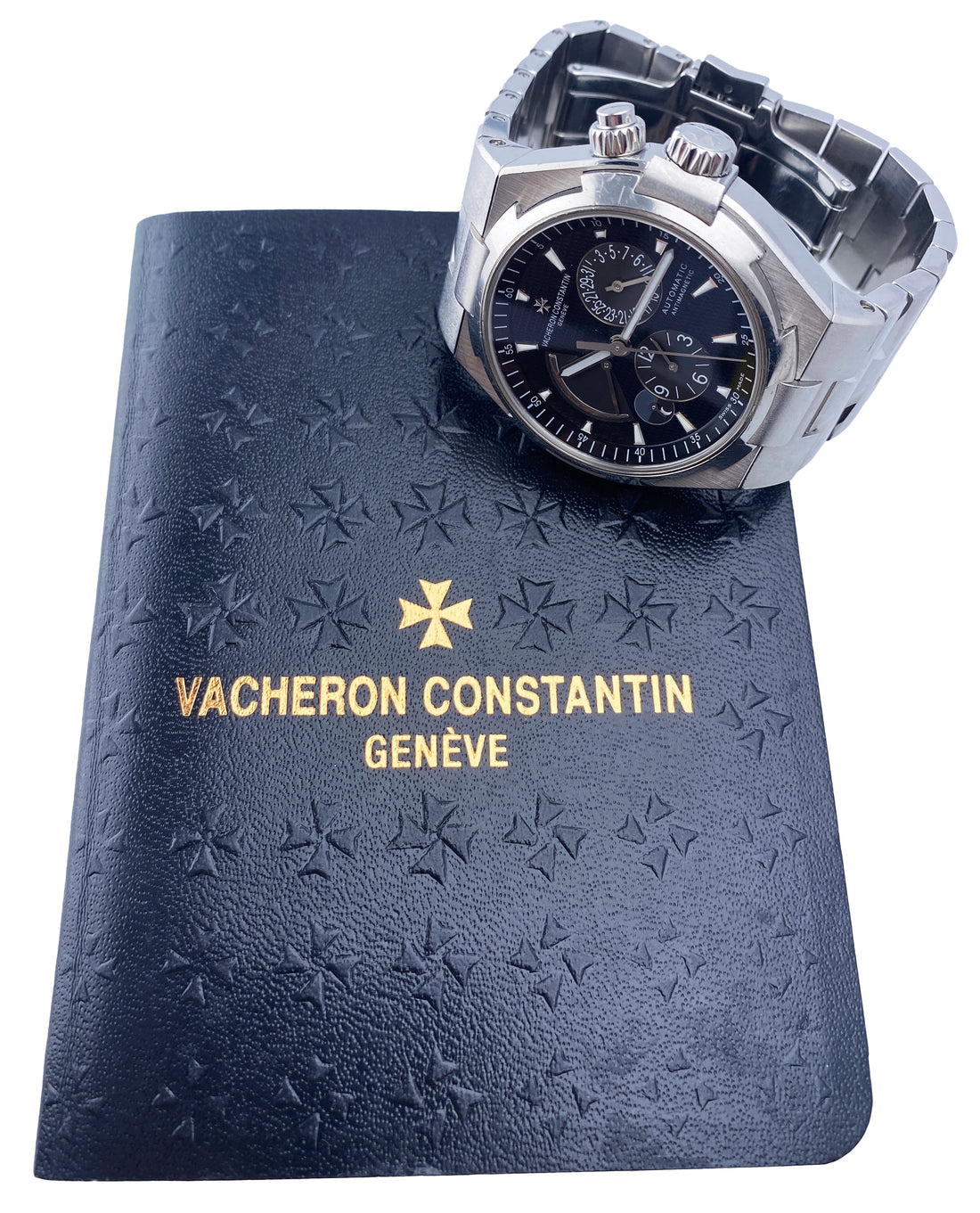 Vacheron Constantin Overseas 47450/B01A-9227 Mens Watch. 42.5mm stainless steel case with stainless steel bezel. Black dial with luminous steel hands and index hour marker. Four sub-dials: Date, 12 hour (dual time), day/night and power reserve indicators. Minute maker on the outer dial. Stainless steel bracelet with fold over clasp with hidden double push button. Will fit up to 6.5-Inch wrist. Sapphire crystal. Stainless steel case back. Automatic self-winding movement. This watch comes with original Papers. Circa: 2013.