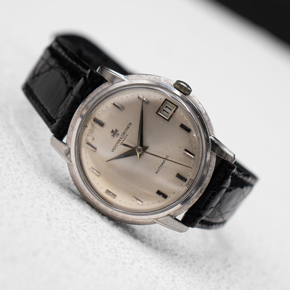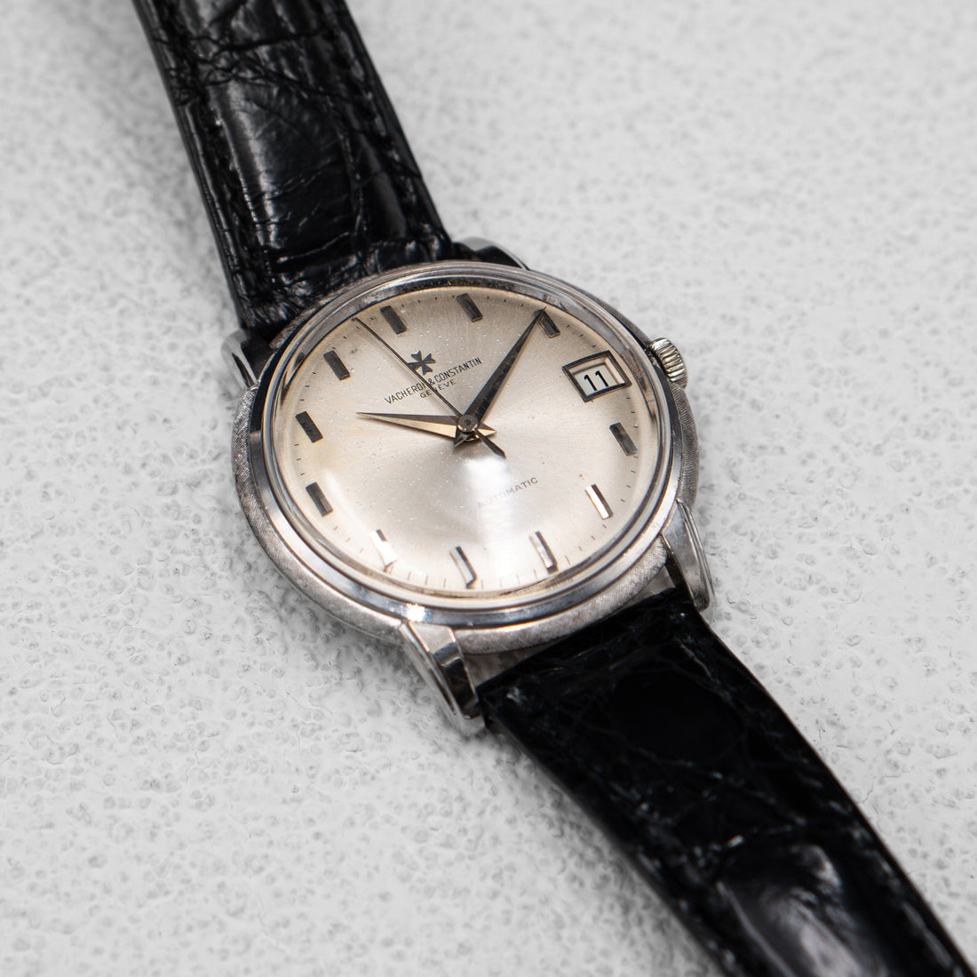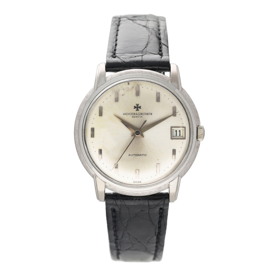 Vacheron Constantin Vintage Mens Watch. 36.00mm 18k white gold case. 18k white gold bezel. Silver dial and index hour markers. Date Indicator. Black leather strap with 18k white gold buckle. Will fit up to 7.00-inch wrist. Acrylic crystal. 18k white gold case back. Automatic movement.