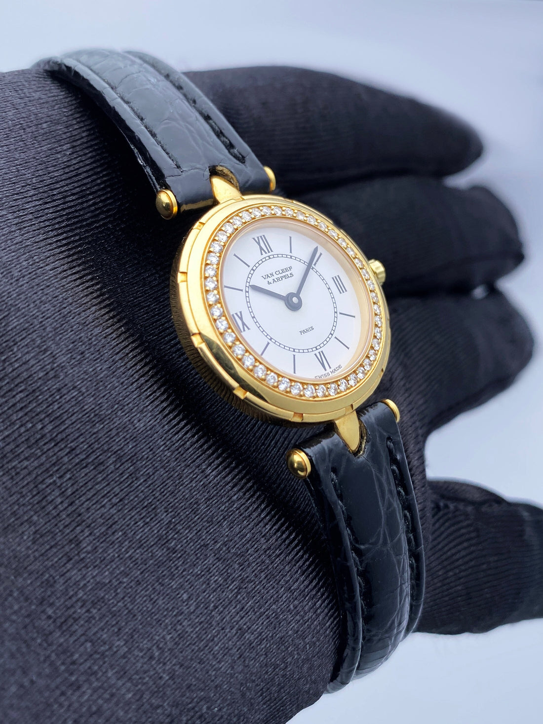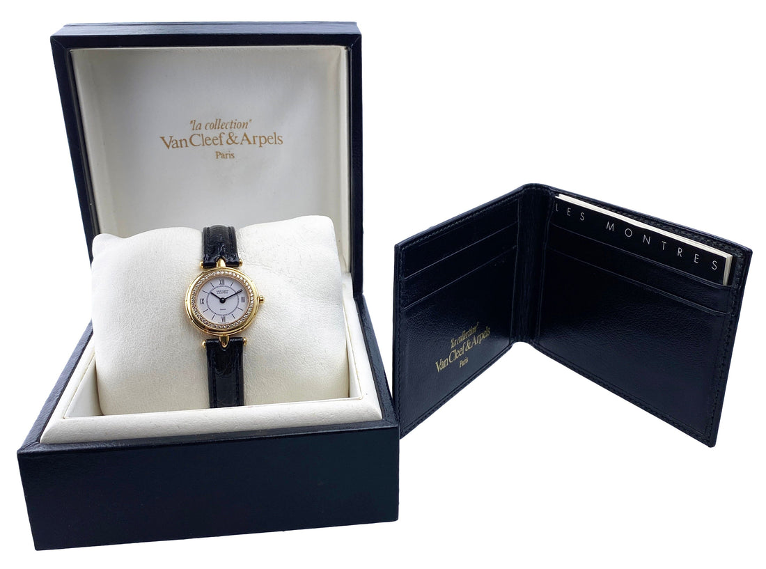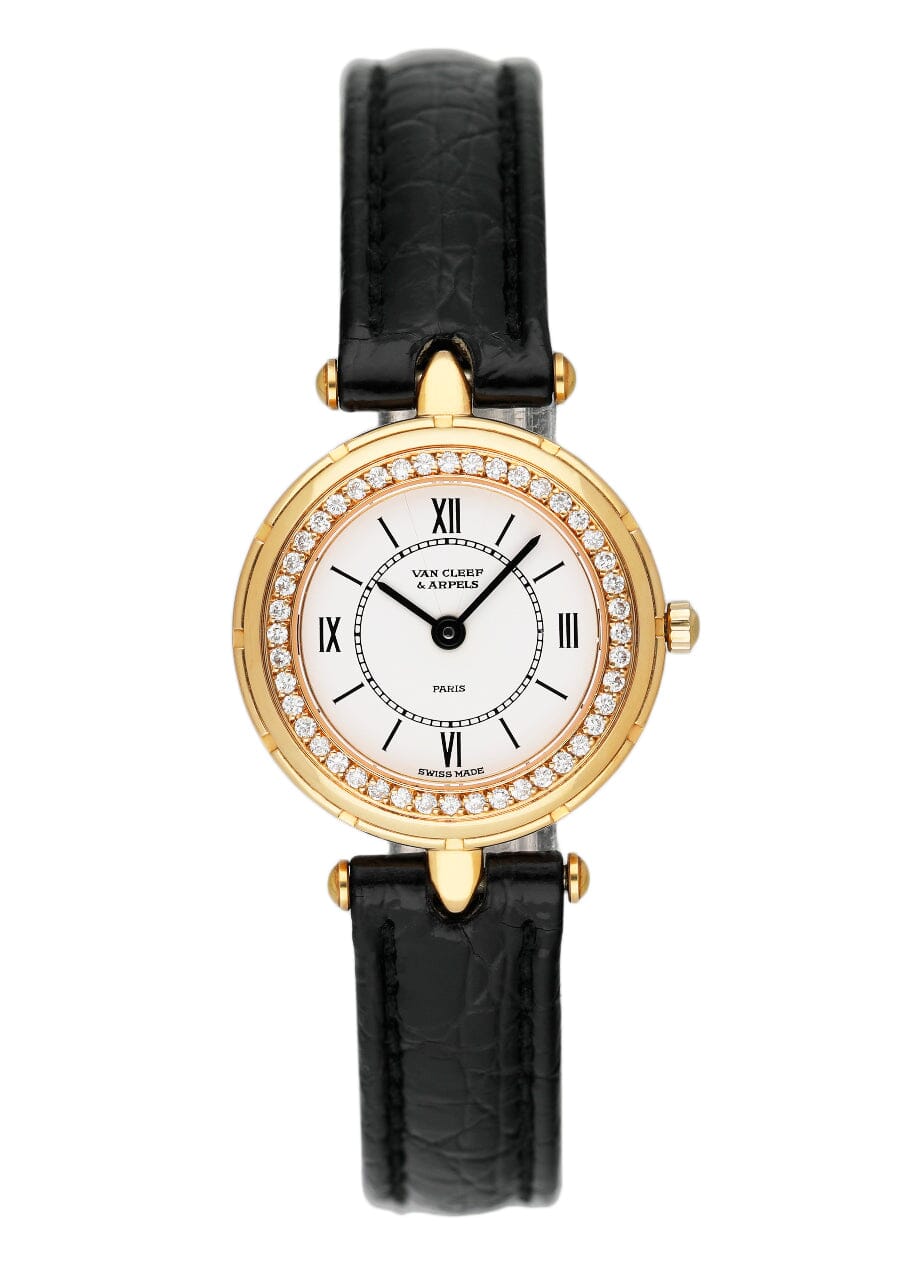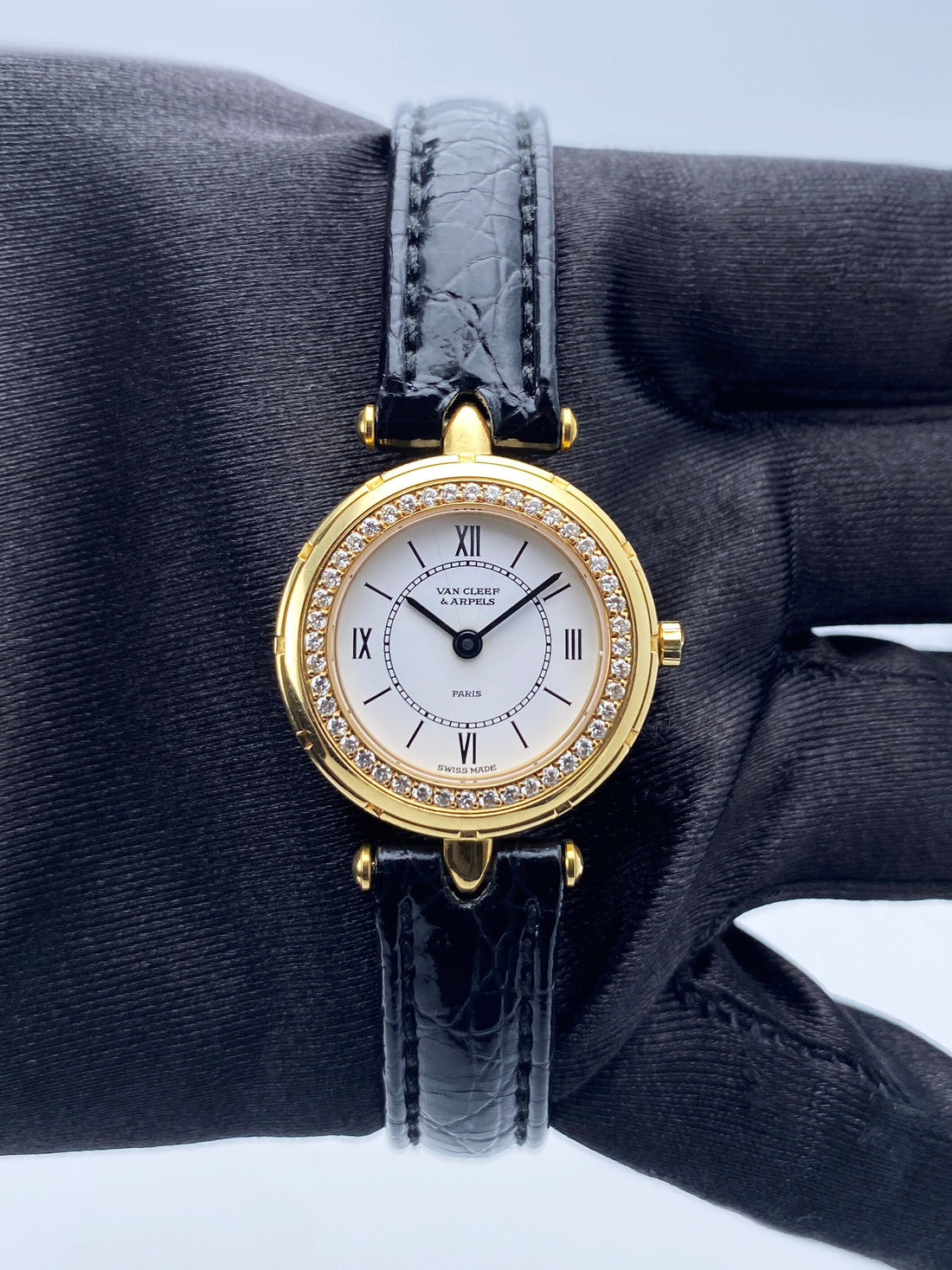 Van Cleef & Arpels La Collection 13607B1 Ladies Watch. 25mm 18K yellow gold case. 18K yellow gold bezel with factory diamond. White dial with gold hands and Roman numeral & index hour marker. Black leather strap with 18K yellow gold & stainless steel hidden butterfly clasp. Will fit up to 6.5-inch wrist. Sapphire crystal. 18K yellow gold case back.Quartz: Battery powered movement. This watch comes with original Box.