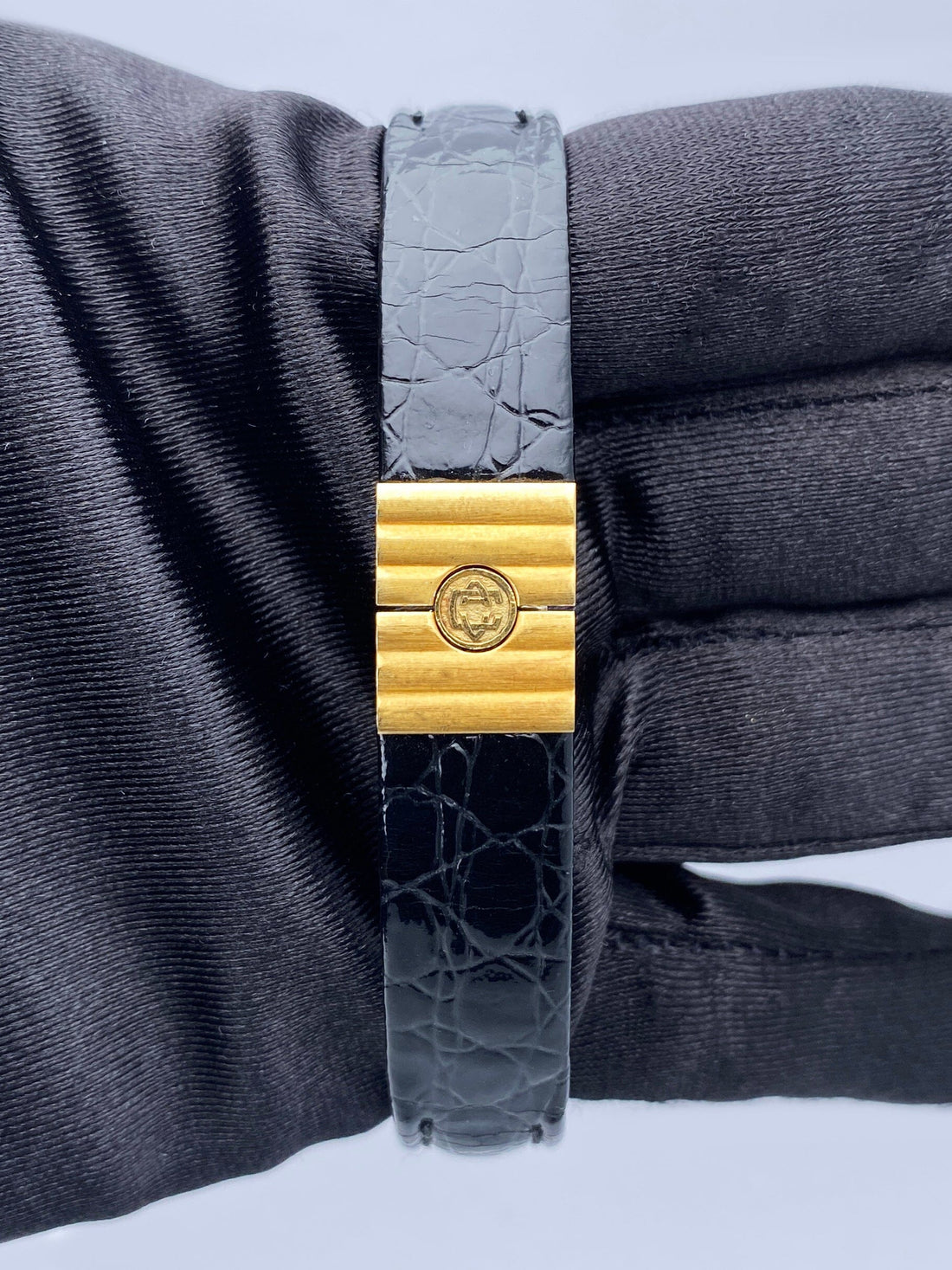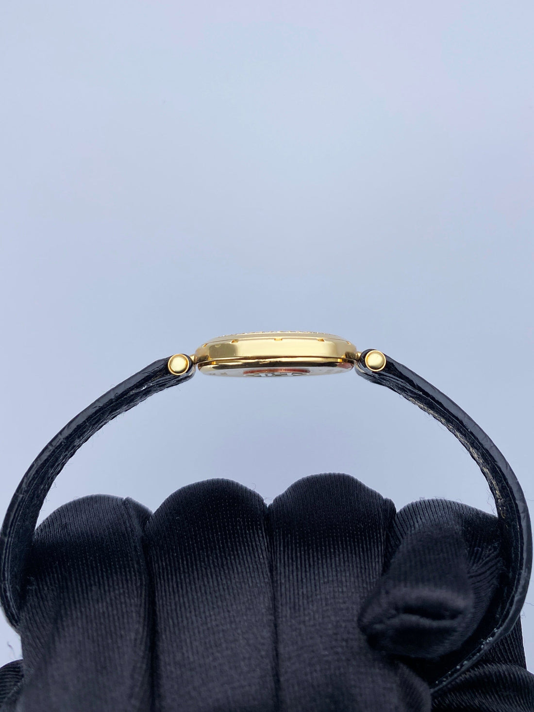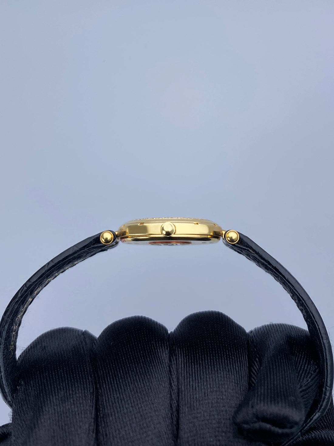 Van Cleef & Arpels La Collection 13607B1 Ladies Watch. 25mm 18K yellow gold case. 18K yellow gold bezel with factory diamond. White dial with gold hands and Roman numeral & index hour marker. Black leather strap with 18K yellow gold & stainless steel hidden butterfly clasp. Will fit up to 6.5-inch wrist. Sapphire crystal. 18K yellow gold case back.Quartz: Battery powered movement. This watch comes with original Box.