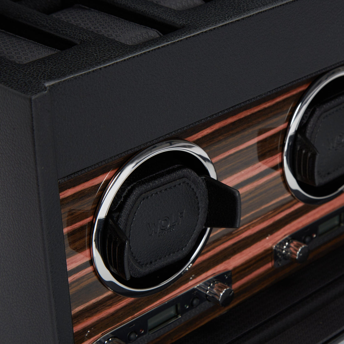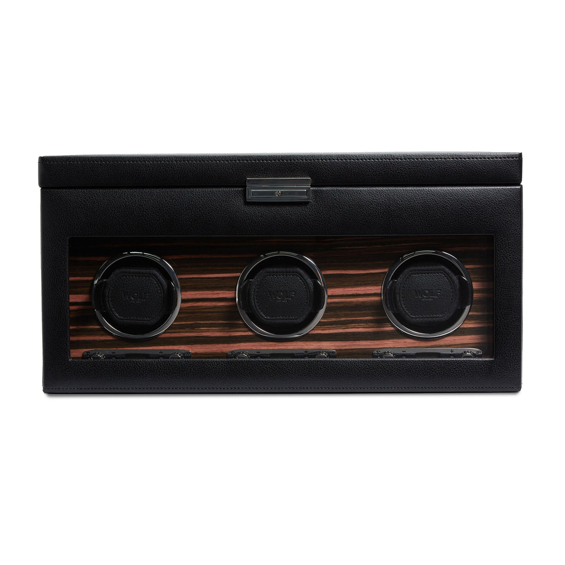 Roadster Triple Watch Winder with Storage is turning your watch perfectly to a precise number of turns, the Roadster's ebony macassar polished wood makes the perfect backdrop for your watch.